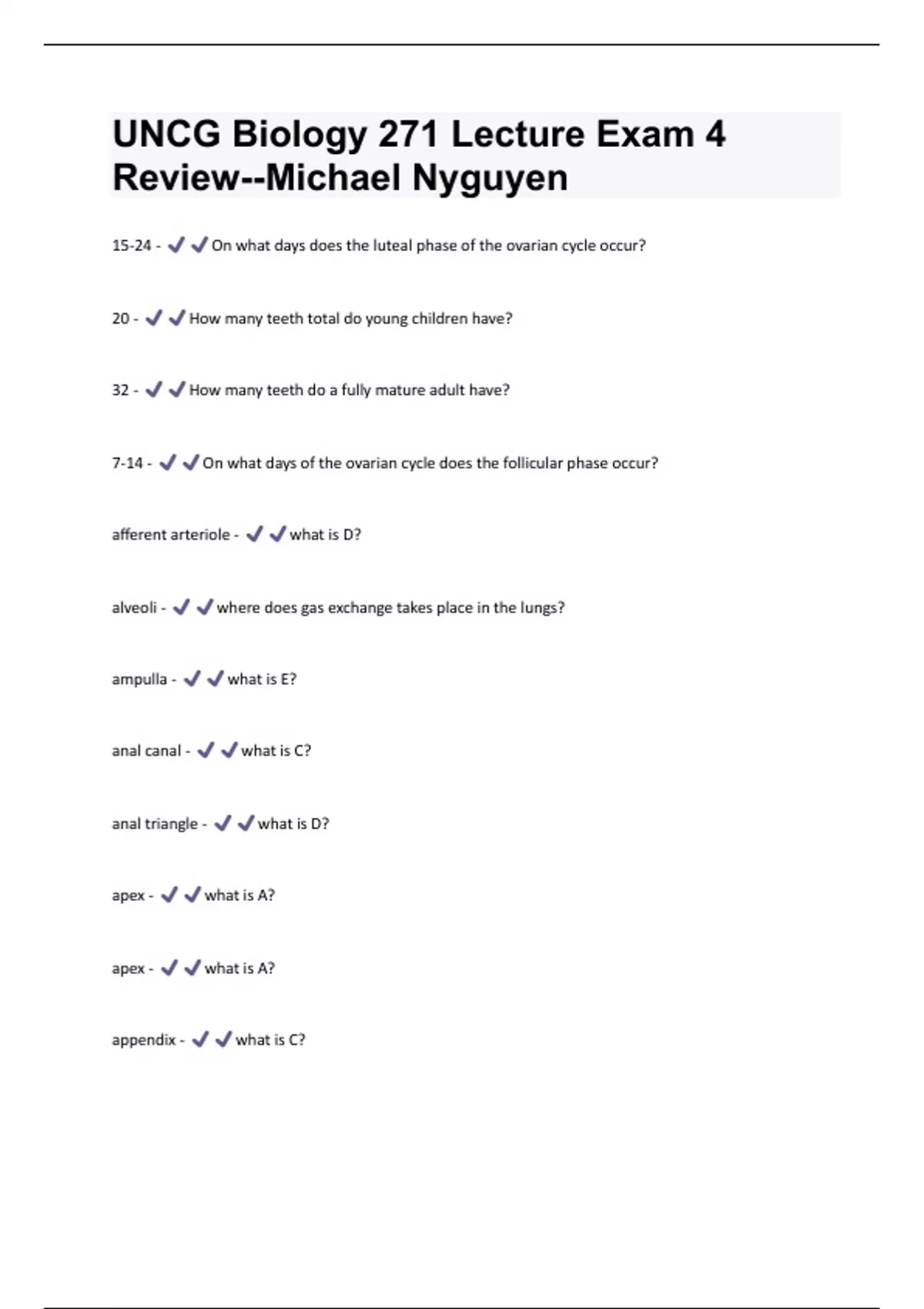 UNCG Biology 271 Lecture Exam 4 Review--Michael Nyguyen Questions & Answers Already Graded A+