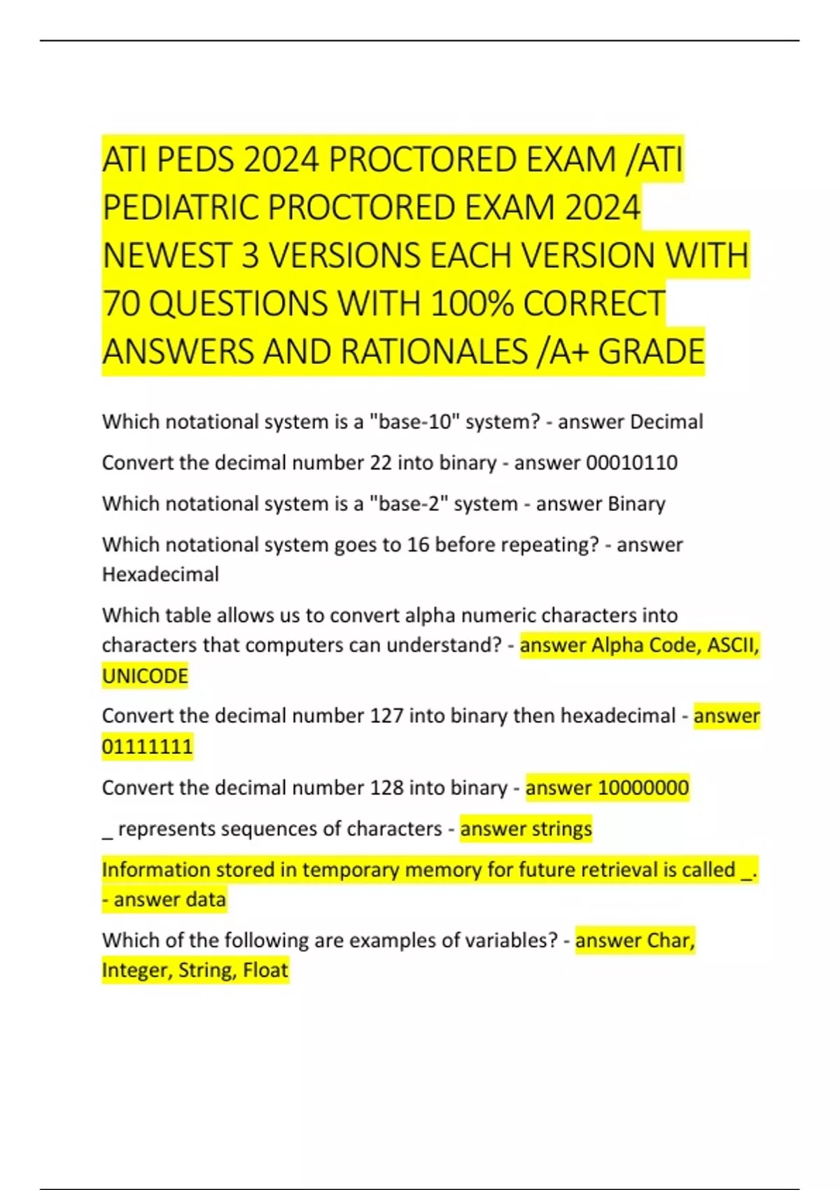 ATI PEDS 2024 PROCTORED EXAM /ATI PEDIATRIC PROCTORED EXAM 2024 NEWEST 3 VERSIONS EACH VERSION WITH 70 QUESTIONS WITH 100% CORRECT ANSWERS AND RATIONALES /A+ GRADE