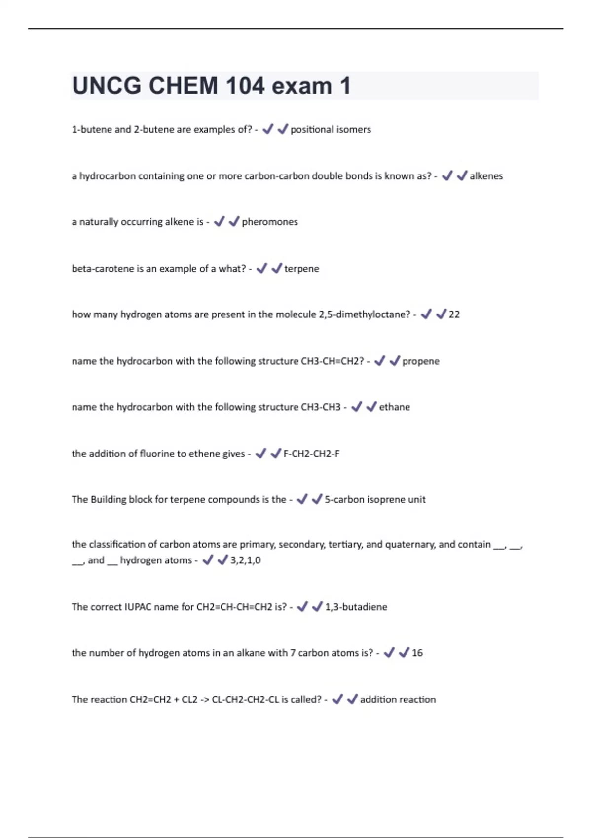 1-butene and 2-butene are examples of? - positional isomers a hydrocarbon containing one or more carbon-carbon double bonds is known as? - alkenes a naturally occurring alkene is - pheromones beta-carotene is an example of a what? - terpene how many hydrogen atoms are present in the molecule 2,5-dimethyloctane? - 22 name the hydrocarbon with the following structure CH3-CH=CH2? - propene name the hydrocarbon with the following structure CH3-CH3 - ethane the addition of fluorine to ethene gives - F-CH2-CH2-F The Building block for terpene compounds is the - 5-carbon isoprene unit the classification of carbon atoms are primary, secondary, tertiary, and quaternary, and contain __, __, __, and __ hydrogen atoms - 3,2,1,0 The correct IUPAC name for CH2=CH-CH=CH2 is? - 1,3-butadiene the number of hydrogen atoms in an alkane with 7 carbon atoms is? - 16 The reaction CH2=CH2 + CL2 -> CL-CH2-CH2-CL is called? - addition reactionThe smallest cycloalkane is? - cyclopropane What are isomers? - compounds with the same molecular formula but different structures and properties what is not a product of fractional distillation - styrene what is used to help ripen fruits? - ethylene