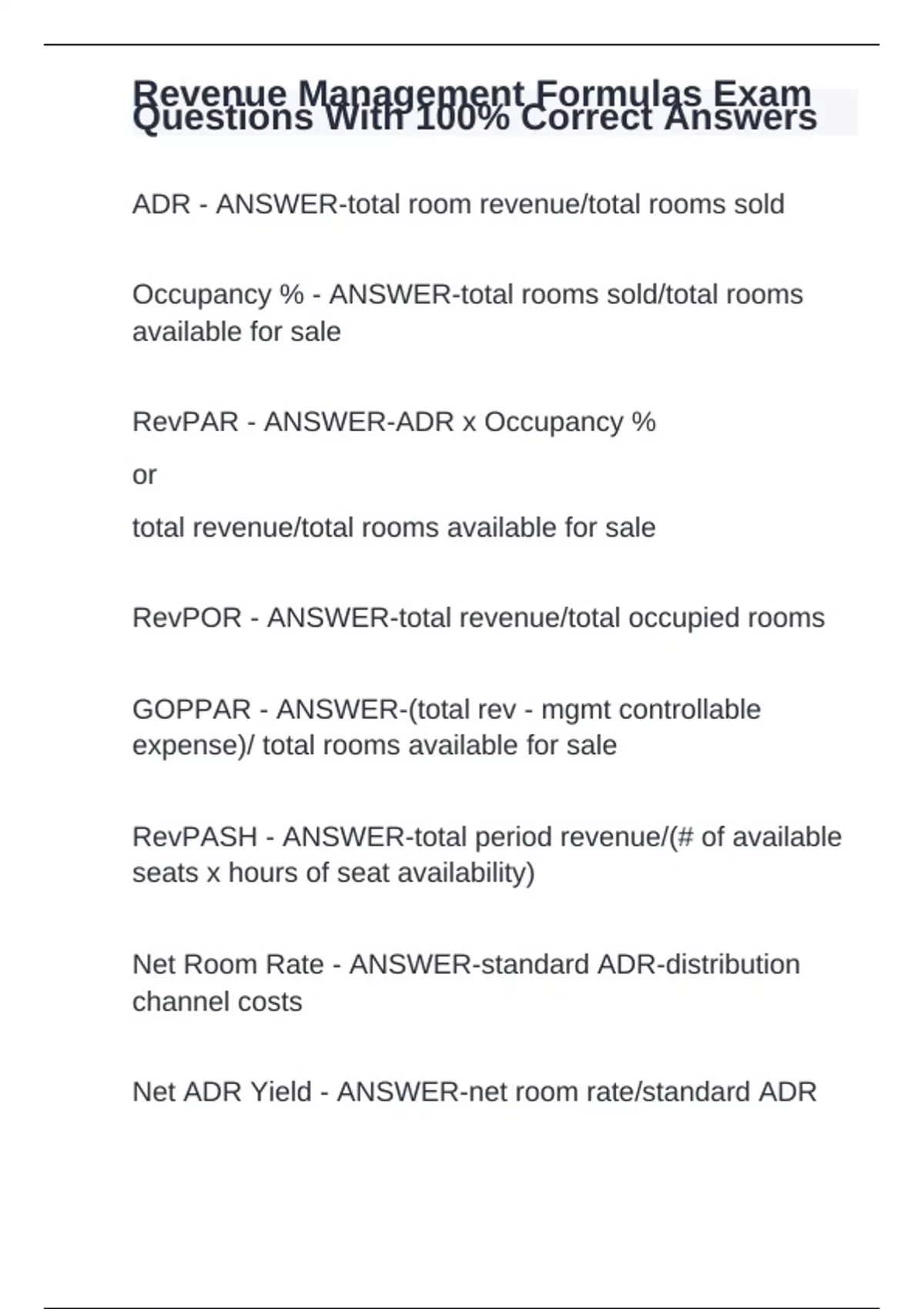 Revenue Management Formulas Exam Questions With 100% Correct Answers