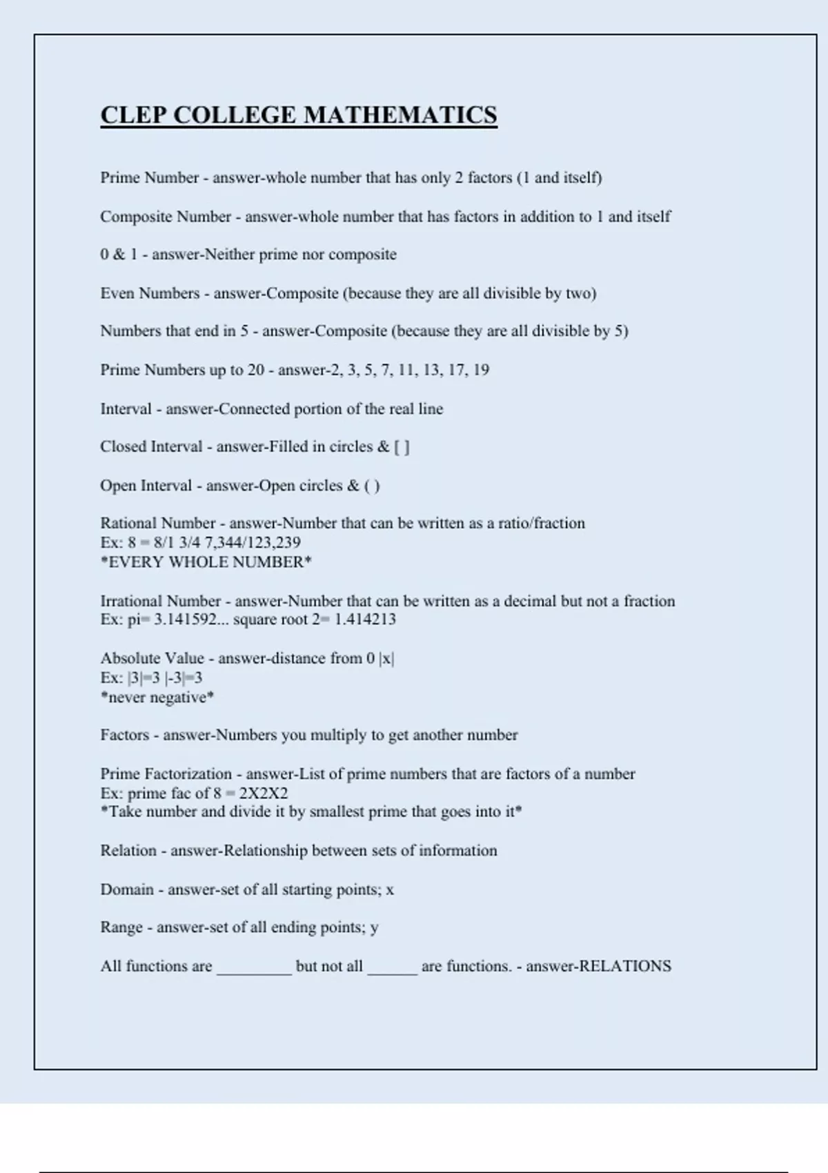 Prime Number - answer-whole number that has only 2 factors (1 and itself) Composite Number - answer-whole number that has factors in addition to 1 and itself 0 & 1 - answer-Neither prime nor composite Even Numbers - answer-Composite (because they are all divisible by two) Numbers that end in 5 - answer-Composite (because they are all divisible by 5) Prime Numbers up to 20 - answer-2, 3, 5, 7, 11, 13, 17, 19 Interval - answer-Connected portion of the real line Closed Interval - answer-Filled in circles & [ ] Open Interval - answer-Open circles & ( ) Rational Number - answer-Number that can be written as a ratio/fraction Ex: 8 = 8/1 3/4 7,344/123,239 *EVERY WHOLE NUMBER* Irrational Number - answer-Number that can be written as a decimal but not a fraction Ex: pi= 3.141592... square root 2= 1.414213 Absolute Value - answer-distance from 0 |x| Ex: |3|=3 |-3|=3 *never negative* Factors - answer-Numbers you multiply to get another number Prime Factorization - answer-List of prime numbers that are factors of a number Ex: prime fac of 8 = 2X2X2 *Take number and divide it by smallest prime that goes into it* Relation - answer-Relationship between sets of information Domain - answer-set of all starting points; x Range - answer-set of all ending points; y All functions are _________ but not all ______ are functions. - answer-RELATIONS Well-behaved Function - answer-relation that has only one y when given one x *Can't share * None can not be matched * If you can draw a _______________ through two points it is NOT a function - answer-VERTICAL LINE Linear Function - answer-f(x)=x D: (-inf, inf) R: (-inf, inf) *Diagonal Line* Constant Function - answer-f(x)=c D: (-inf, inf) R: (y|y=c) *Horizontal Line* Quadratic Function - answer-f(x)=x^2 D: (-inf, inf) R: [0, inf) *Smile/Increases Quickly* Cubic Function - answer-f(x)=x^3 D: (-inf, inf) R: (-inf, inf) *Mirror Half Quadratic* Square Root Function - answer-f(x)=sq rt x D: [0, inf) R: [0, inf) *Sideways Quadratic* Absolute Value Function - answer-f(x) =|x| D: (-inf, inf) R: [0, inf) *A V* Graphing a Function - answer-1) find at least 4 ordered pair solutions 2) plot points 3) connect X/Y Intercept - answer-Where graph crosses that axis whether it be x or y If no vertical line can be drawn so that it intersects more than once it is a _______. - answer-FUNCTION Increasing - answer-Going up left to right Decreasing - answer-Going down left to right Constant - answer-horizontal Even - answer-Replacing x with -x doesn't change the function Odd - answer-Replacing x with -x changes every sign of every term Greatest Integer Function - answer-Greatest integer that is less than or equal to x; int(x) Function - answer-No duplicate x's in set, all x's go to y's and are different If it is a fraction, set denominator to ____ then solve. - answer-0 Composition - answer-Plus entire function in for x; symbol is o Inverse - answer-Same points just reversed 1) Draw points 2) Draw reflection line (diagonal through 0,0) 3) reflect points Set - answer-Collection of distinct objects *Sets are ONLY EQUAL if they have the SAME EXACT ELEMENTS*