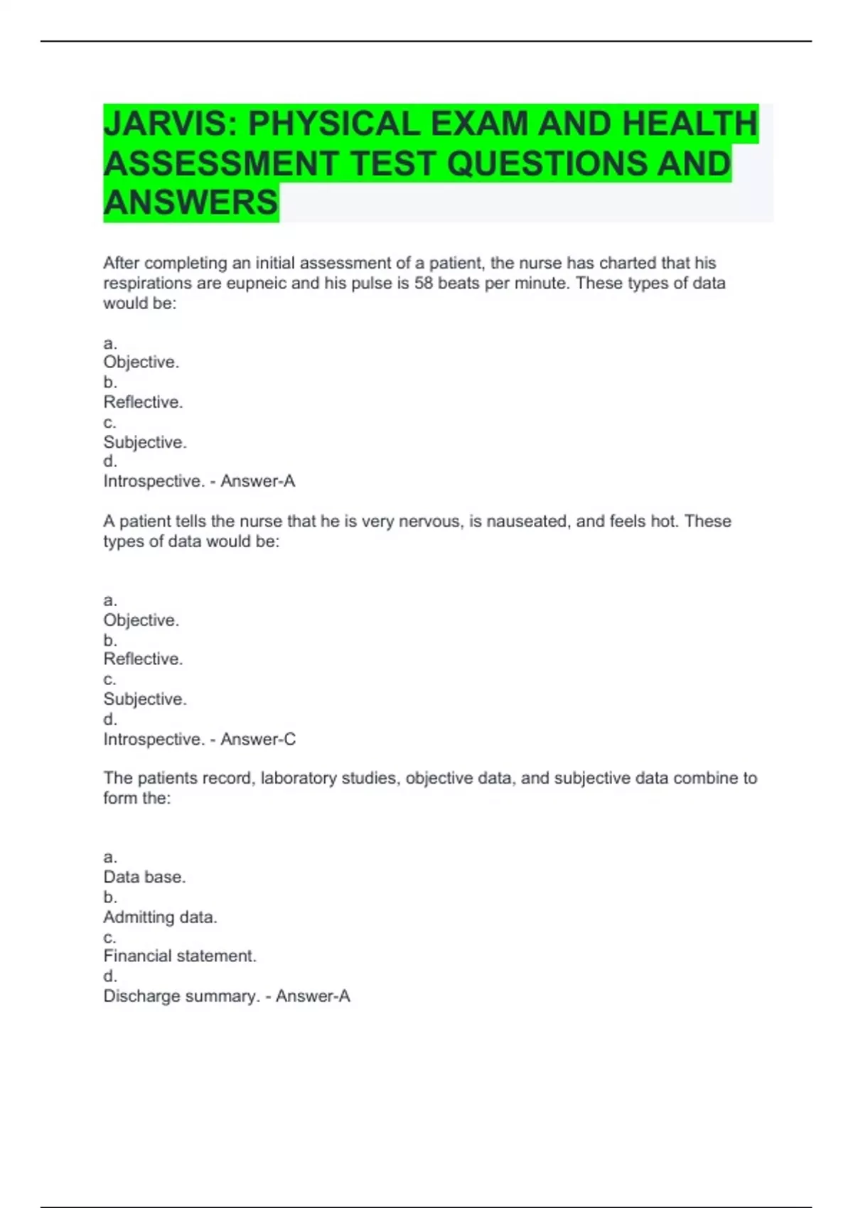 JARVIS: PHYSICAL EXAM AND HEALTH ASSESSMENT TEST QUESTIONS AND ANSWERS