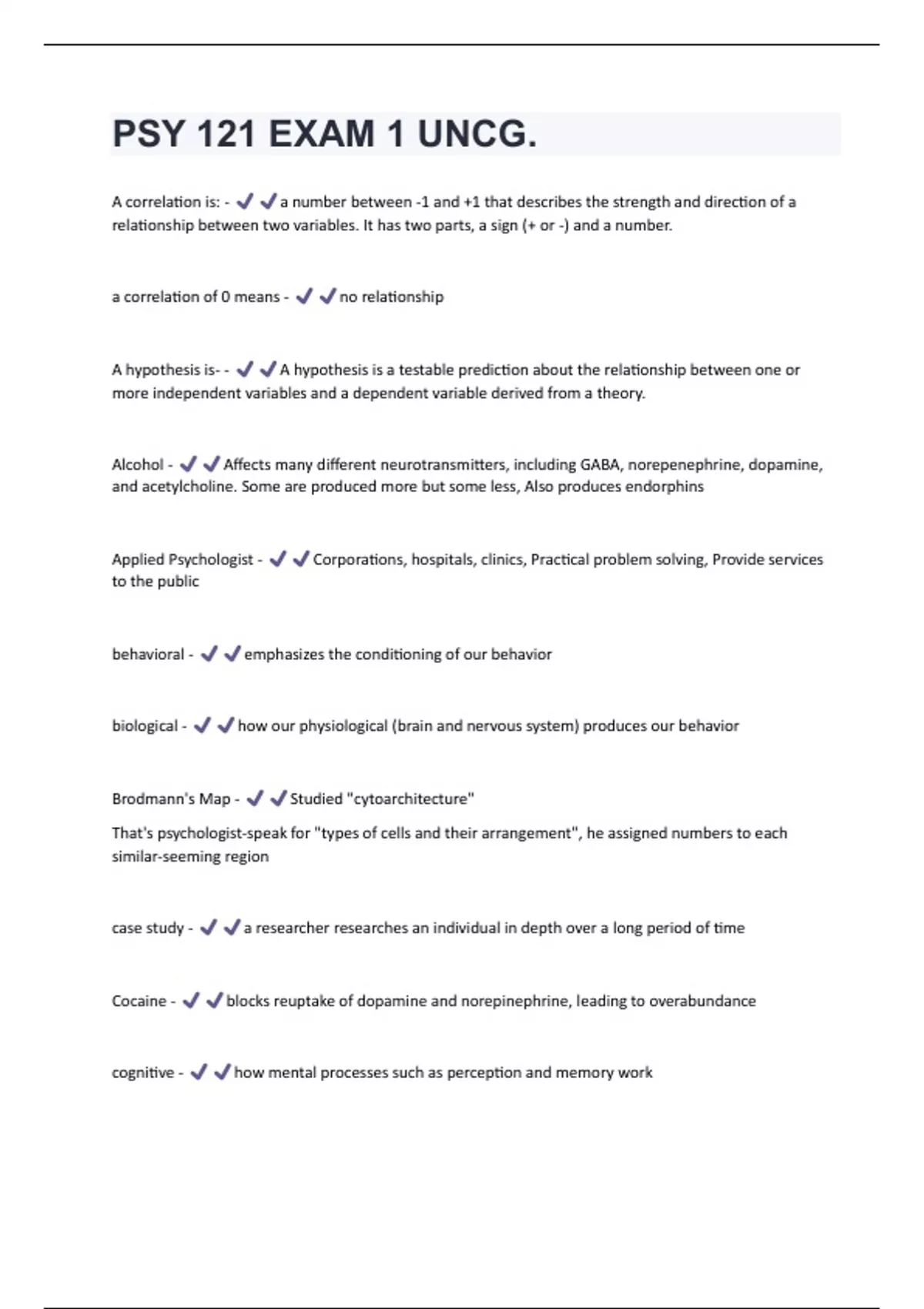 A correlation is: - a number between -1 and +1 that describes the strength and direction of a relationship between two variables. It has two parts, a sign (+ or -) and a number. a correlation of 0 means - no relationship A hypothesis is- - A hypothesis is a testable prediction about the relationship between one or more independent variables and a dependent variable derived from a theory. Alcohol - Affects many different neurotransmitters, including GABA, norepenephrine, dopamine, and acetylcholine. Some are produced more but some less, Also produces endorphins Applied Psychologist - Corporations, hospitals, clinics, Practical problem solving, Provide services to the public behavioral - emphasizes the conditioning of our behavior biological - how our physiological (brain and nervous system) produces our behavior Brodmann's Map - Studied "cytoarchitecture" That's psychologist-speak for "types of cells and their arrangement", he assigned numbers to each similar-seeming region case study - a researcher researches an individual in depth over a long period of time Cocaine - blocks reuptake of dopamine and norepinephrine, leading to overabundance cognitive - how mental processes such as perception and memory workCT Scan - Pronounced "Cat" scan•Uses x-rays, Not very detailed, Good for spotting major damage Difference between central nervous system and peripheral nervous system - CNS is made up of the brain and spinal cord, the PNS is the part of the nervous system that links the CNS with the body's receptors, muscles, and glands Electrochemical process: - Both electrical - the action potential (in the cell) and chemical - neurotransmitters (between cells) ERP/EEG - Reads electrical impulses through the skull, Good temporal resolution (know WHEN things happened), Bad spatial resolution (don't know WHERE) Experimental Psychologist: - Usually work at universities, Some at hospitals/clinics, Produce research on behavior fMRI- - Functional Magnetic Resonance Imaging Uses big magnets, Detects oxygen in blood, As more blood comes to an area, more oxygen comes with it, Great spatial resolution, poor temporal resolution Four Major Research perspectives - Behavioral, sociocultural, cognitive, and biological perspectives Glial cells - provide structure and nutrition hindsight bias - the tendency- after learning about an outcome, to be overconfident in ones ability to have ''predicted'' it.