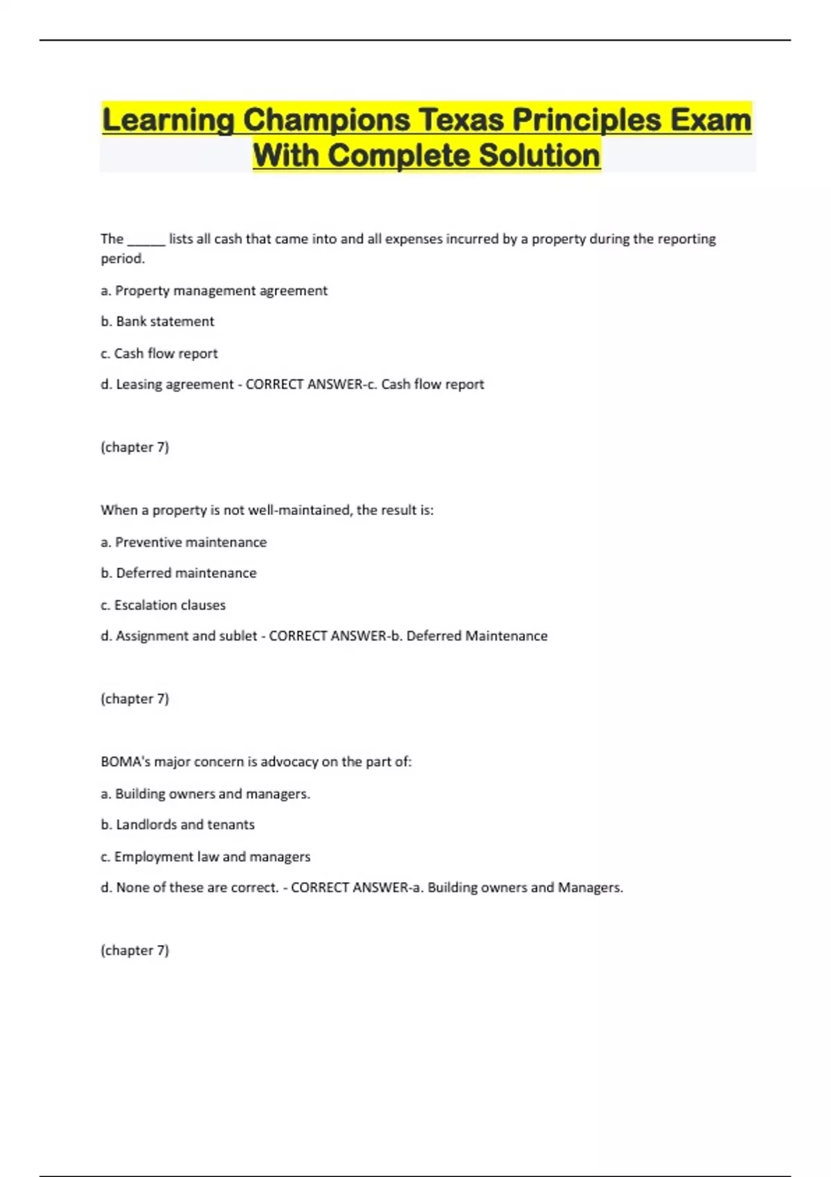 Learning Champions Texas Principles Exam With Complete Solution The _____ lists all cash that came into and all expenses incurred by a property during the reporting period. a. Property management agreement b. Bank statement c. Cash flow report d. Leasing agreement - CORRECT ANSWER-c. Cash flow report (chapter 7) When a property is not well-maintained, the result is: a. Preventive maintenance b. Deferred maintenance c. Escalation clauses d. Assignment and sublet - CORRECT ANSWER-b. Deferred Maintenance (chapter 7) BOMA's major concern is advocacy on the part of: a. Building owners and managers. b. Landlords and tenants c. Employment law and managers d. None of these are correct. - CORRECT ANSWER-a. Building owners and Managers. (chapter 7) Which of the following defines the rights and obligations of both landlord and tenant in the leasing of residential and commercial properties? a. Statute of Frauds b. Landlord and Tenant Act c. Federal Fair Housing Act d. TREC statutes - CORRECT ANSWER-b. landlord and Tenant Act (chapter 6) A(n) ______ is a lease of property where the landlord pays charges regularly incurred in ownership, such as taxes, insurance, utilities, and repairs. The tenant pays only rent. a. Graduated lease b. Net lease c. Lease and take back d. Gross lease - CORRECT ANSWER-d. Gross lease