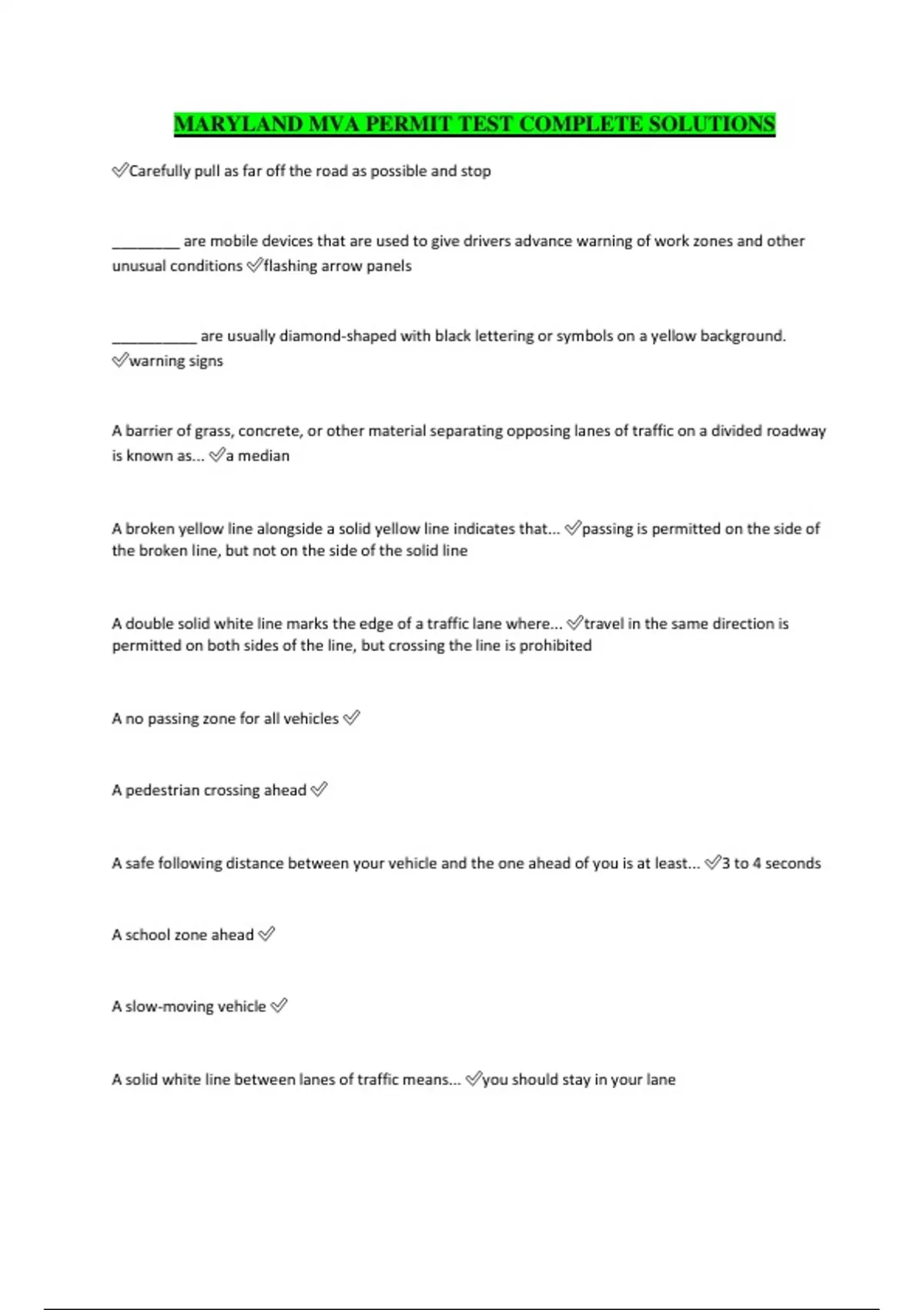 MARYLAND MVA PERMIT TEST COMPLETE SOLUTIONS Carefully pull as far off the road as possible and stop ________ are mobile devices that are used to give drivers advance warning of work zones and other unusual conditions flashing arrow panels __________ are usually diamond-shaped with black lettering or symbols on a yellow background. warning signs A barrier of grass, concrete, or other material separating opposing lanes of traffic on a divided roadway is known as... a median A broken yellow line alongside a solid yellow line indicates that... passing is permitted on the side of the broken line, but not on the side of the solid line A double solid white line marks the edge of a traffic lane where... travel in the same direction is permitted on both sides of the line, but crossing the line is prohibited A no passing zone for all vehicles A pedestrian crossing ahead A safe following distance between your vehicle and the one ahead of you is at least... 3 to 4 seconds A school zone ahead A slow-moving vehicle A solid white line between lanes of traffic means... you should stay in your lane A solid yellow line on your side of the road indicates a... no-passing zone A typical passenger car can start to hydroplane at speeds as low as... 35 mph Another road crosses your road ahead; be alert for cross traffic As you approach a roundabout, always enter to the _______ of the central island. right At an intersection, a red arrow signal indicates that... turning traffic must stop At an intersection, a steady yellow arrow pointing left indicates... the left-turn signal is about to turn to red At an intersection, a steady yellow left arrow means... the left arrow is about to change to red At night, you should use high-beam headlights when driving... in open country with no traffic in sight Before reaching the crest of a hill or entering a curve, you must... slow down, move to the right side of the road, and watch for oncoming vehicles Being constantly aware of driving conditions, planning ahead, anticipating dangers, and taking the right actions to avoid obstacles or other vehicles is known as... defensive driving Do not _________ at crash scenes or locations along the highway where a law enforcement officer may have pulled a vehicle off the road rubbernec