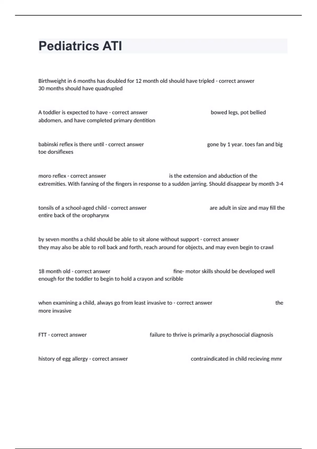 Birthweight in 6 months has doubled for 12 month old should have tripled - correct answer 30 months should have quadrupled A toddler is expected to have - correct answer bowed legs, pot bellied abdomen, and have completed primary dentition babinski reflex is there until - correct answer gone by 1 year. toes fan and big toe dorsiflexes moro reflex - correct answer is the extension and abduction of the extremities. With fanning of the fingers in response to a sudden jarring. Should disappear by month 3-4 tonsils of a school-aged child - correct answer are adult in size and may fill the entire back of the oropharynx by seven months a child should be able to sit alone without support - correct answer they may also be able to roll back and forth, reach around for objects, and may even begin to crawl 18 month old - correct answer fine- motor skills should be developed well enough for the toddler to begin to hold a crayon and scribble when examining a child, always go from least invasive to - correct answer the more invasive FTT - correct answer failure to thrive is primarily a psychosocial diagnosis history of egg allergy - correct answer contraindicated in child recieving mmr known neuro disorder or seizure history - correct answer makes client at higher risk for adverse affects to a pertussis immunization posterior fontanel closes - correct answer in 2- 4months anterior fontanel closes - correct answer in 12-18 months no whole milk until the age of - correct answer 2 by months 4 -6, head lag should - correct answer hardly be evident, head control should be well established pyloroyotomy - correct answer release of hyperetrophied muscle around the pyloric sphincter. give small frequent feedings post op. children with cystic fybrosis should increase their - correct answer protein intake weight is most sensitive indicator - correct answer of hydration status in all ages koplic spots - correct answer are characteristics of measles. blue white spots in the buccal mucosa antistreptolysin or "ASO" titer - correct answer is done to test for recent strept infectio acute glomerulonephritis is - correct answer accompanied by hematuria find out UO of children - correct answer Maintain urine output of 1 to 2 mL/kg/hr if the child weighs less than 30 kg (66 lb). Maintain urine output of 30 mL/hr if the child weighs more than 30 kg (66 lb). Child with HIV should recieve vaccinations - correct answer but should not recieve OPV (oral polio vacination) mylomeningocele - correct answer Meningocele - A spinal defect and sac-like protrusion are present, but only spinal fluid and meninges are present in the sac. After the sac is repaired, no further symptoms are usually seen because spinal nerves are not damaged. ■ Myelomeningocele - The sac includes meninges, spinal fluid, and nerves. thalassemia major - correct answer frequent transfusions vaccinations - correct answer Diphtheria and tetanus toxoids and acellular pertussis vaccine (DTaP) - Doses at 2, 4, 6, and 15 to 18 months and again at 4 to 6 years of age Tetanus and diphtheria toxoids and pertussis vaccine (DTaP) - One dose at 11 to 12 years of age Tetanus and diphtheria (Td) booster - One dose every 10 years following DTaP Haemophilus influenza type b (Hib) - Doses at 2, 4, 6, and at 12 to 15 months Rotavirus (RV) oral vaccine - Available in two formulations RotaTeq requires three doses beginning at 6 weeks of age, with subsequent doses 4 to 10 weeks apart. RotaTeq vaccination should be completed before 32 weeks of age.Vaccination should not be initiated for infants 15 weeks of age or older. Rotarix requires 2 doses beginning at 6 weeks of age with the next dose4weeks later. All doses should be completed by 8 months of age. Inactivated poliovirus vaccine (IPV)-Doses at 2, 4, and 6 to 18 months and again at 4 to 6 years Measles, mumps, and rubella vaccine (MMR) - Doses at 12 to 15 months and at 4 to 6 years Varicella vaccine - One dose at 12 to 15 months and again at 4 to 6 years or 2 doses administered 4 weeks apart if administered after age 13 Pneumococcal conjugate vaccine (PCV) - Doses at 2, 4, 6, and 12 to 15 months Hepatitis A (Hep A) - Two doses 6 months apart after 12 months of age Hepatitis B (Hep B) - Within 12 hr after birth with additional doses at 1 to 2 months and 6 to 18 months of age Seasonal influenza vaccine - Annually beginning at 6 months, the trivalent inactivated influenza vaccine (TIV) should be given. Starting at 2 years of age, the live attenuated influenza vaccine (LAIV) (nasal spray) should be used. October through November is the ideal time, but December is acceptable. Meningococcal vaccine (MCV4) - One dose at 11 to 12 years of age (earlier if specific risk factors are present) Human Papilloma after administration of glucagon - correct answer possible vomitus; place in side lying position peak expiratory flow rate is between - correct answer 80-100 provide small frequent feedings to a child - correct answer who has had heart failure; helps conserve energy due to high metabolic rate gentamicin - correct answer is contraindicated in client with botulism poisoning dress child in minimal clothing when - correct answer they have a high fever thermoregulation is regulated by - correct answer brainstem a decrease in tear production may be an indication of - correct answer worsening dehydration testing for pku - correct answer 2 week follow up stool sample with possible rotavirus - correct answer should be placed in a biohazard bag bronchiolitis usually occurs in children under the age of 2 and - correct answer is mainly caused by the respiratory sincytial virus Providing small frequent meals - correct answer to a child with heart failure will help in conserving energy. cleft repair children - correct answer shouldnt have a pacifier scabies itching can last for 2-3 week s - correct answer itching can last until the sk