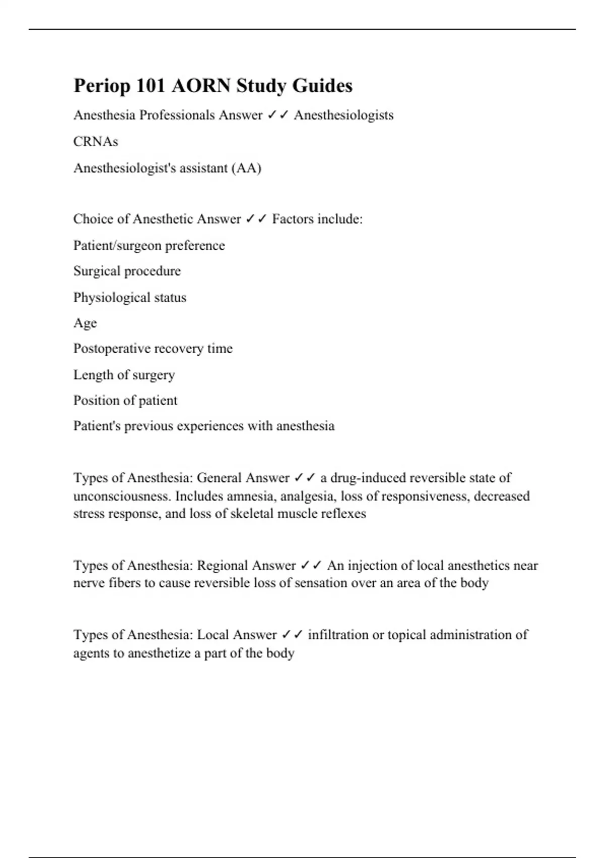 Anesthesia Professionals Answer Anesthesiologists CRNAs Anesthesiologist's assistant (AA) Choice of Anesthetic Answer Factors include: Patient/surgeon preference Surgical procedure Physiological status Age Postoperative recovery time Length of surgery Position of patient Patient's previous experiences with anesthesia Types of Anesthesia: General Answer a drug-induced reversible state of unconsciousness. Includes amnesia, analgesia, loss of responsiveness, decreased stress response, and loss of skeletal muscle reflexes Types of Anesthesia: Regional Answer An injection of local anesthetics near nerve fibers to cause reversible loss of sensation over an area of the body Types of Anesthesia: Local Answer infiltration or topical administration of agents to anesthetize a part of the body