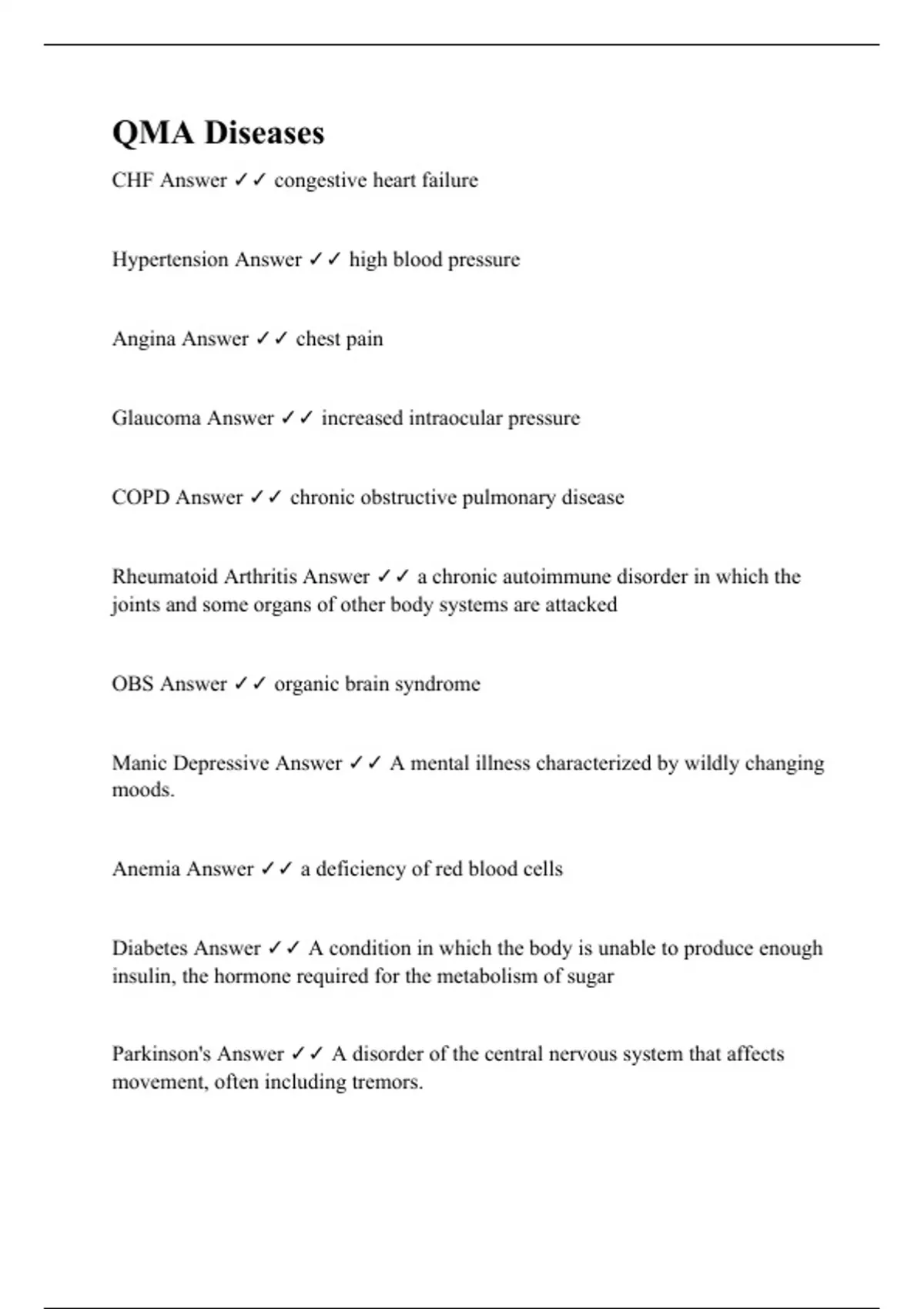 CHF Answer congestive heart failure Hypertension Answer high blood pressure Angina Answer chest pain Glaucoma Answer increased intraocular pressure COPD Answer chronic obstructive pulmonary disease Rheumatoid Arthritis Answer a chronic autoimmune disorder in which the joints and some organs of other body systems are attacked OBS Answer organic brain syndrome Manic Depressive Answer A mental illness characterized by wildly changing moods. Anemia Answer a deficiency of red blood cells Diabetes Answer A condition in which the body is unable to produce enough insulin, the hormone required for the metabolism of sugar