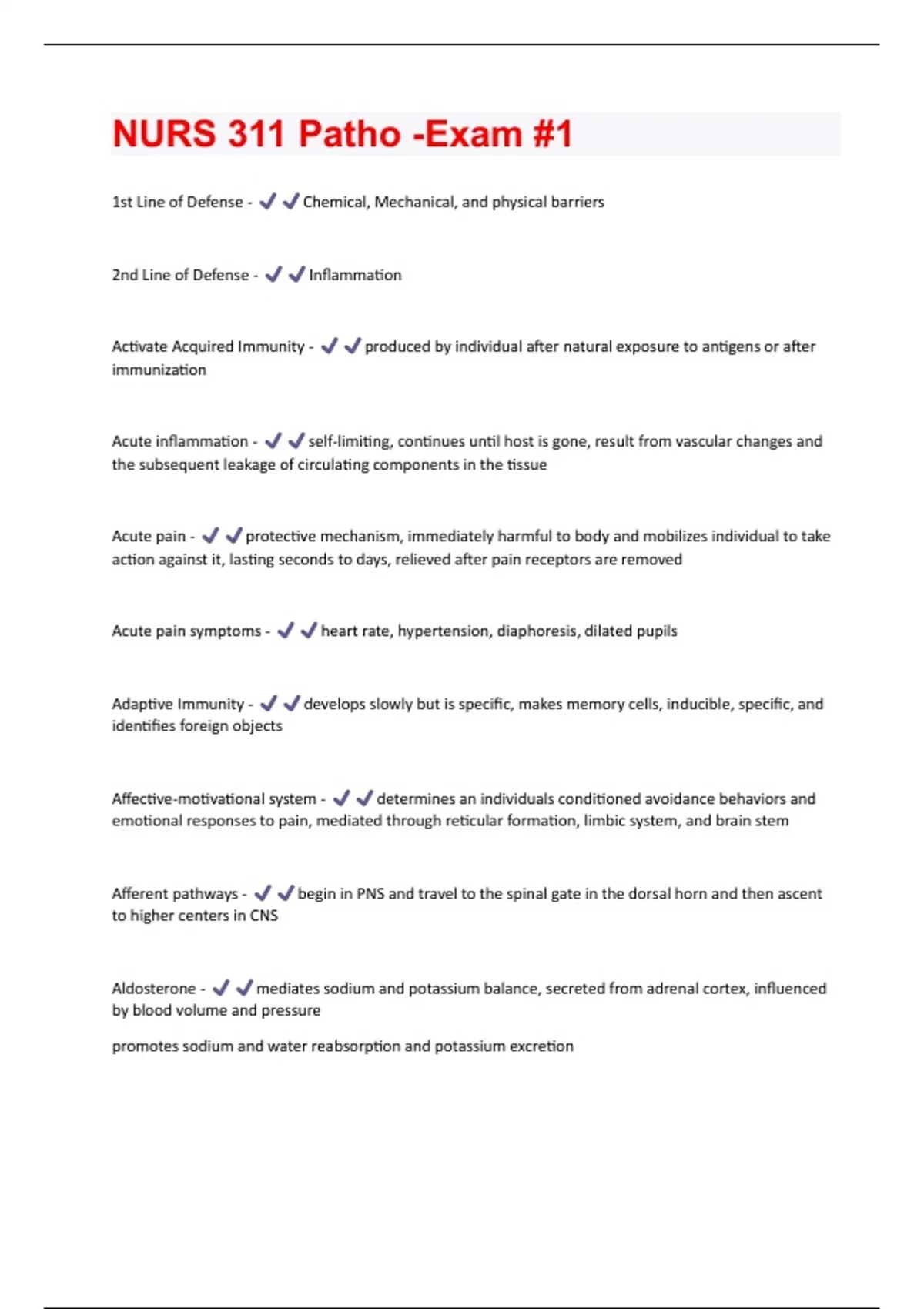 1st Line of Defense - Chemical, Mechanical, and physical barriers 2nd Line of Defense - Inflammation Activate Acquired Immunity - produced by individual after natural exposure to antigens or after immunization Acute inflammation - self-limiting, continues until host is gone, result from vascular changes and the subsequent leakage of circulating components in the tissue Acute pain - protective mechanism, immediately harmful to body and mobilizes individual to take action against it, lasting seconds to days, relieved after pain receptors are removed Acute pain symptoms - heart rate, hypertension, diaphoresis, dilated pupils Adaptive Immunity - develops slowly but is specific, makes memory cells, inducible, specific, and identifies foreign objects Affective-motivational system - determines an individuals conditioned avoidance behaviors and emotional responses to pain, mediated through reticular formation, limbic system, and brain stem Afferent pathways - begin in PNS and travel to the spinal gate in the dorsal horn and then ascent to higher centers in CNS Aldosterone - mediates sodium and potassium balance, secreted from adrenal cortex, influenced by blood volume and pressure promotes sodium and water reabsorption and potassium excretionAllergic Contact Dermatitis - inflammation of skin caused by allergic reaction externally Alternative Pathway - is activated by several substances found on surface of infectious organisms, uses unique proteins to form C3, which leads to C5 which leads to convergence on classical pathway Anaphylatoxins - induce rapid degranulation of mast cells, major components of inflammation Angiotensin I - inactive polypeptide, ACE coverts to angiotensin II angiotensin II - stimulates secretion of aldosterone and causes vasoconstriction