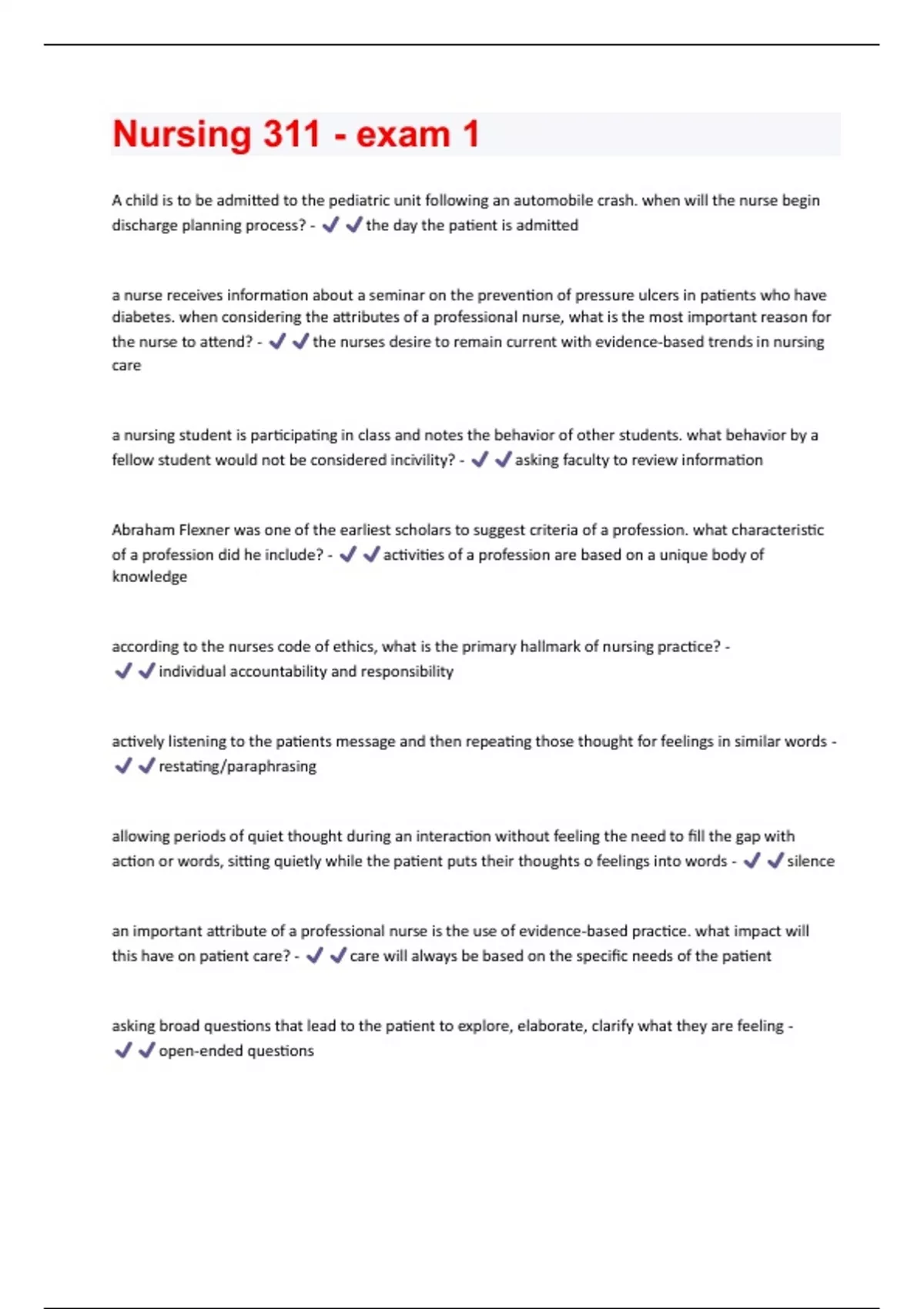 A child is to be admitted to the pediatric unit following an automobile crash. when will the nurse begin discharge planning process? - the day the patient is admitted a nurse receives information about a seminar on the prevention of pressure ulcers in patients who have diabetes. when considering the attributes of a professional nurse, what is the most important reason for the nurse to attend? - the nurses desire to remain current with evidence-based trends in nursing care a nursing student is participating in class and notes the behavior of other students. what behavior by a fellow student would not be considered incivility? - asking faculty to review information Abraham Flexner was one of the earliest scholars to suggest criteria of a profession. what characteristic of a profession did he include? - activities of a profession are based on a unique body of knowledge according to the nurses code of ethics, what is the primary hallmark of nursing practice? - individual accountability and responsibility actively listening to the patients message and then repeating those thought for feelings in similar words - restating/paraphrasing allowing periods of quiet thought during an interaction without feeling the need to fill the gap with action or words, sitting quietly while the patient puts their thoughts o feelings into words - silence an important attribute of a professional nurse is the use of evidence-based practice. what impact will this have on patient care? - care will always be based on the specific needs of the patient asking broad questions that lead to the patient to explore, elaborate, clarify what they are feeling - open-ended questionsattempting to protect a nurse or faculty from negative comments - being defensive awareness of, sensitivity to, and identification with the feelings of another person - empathy caused by preconceived ideas, stereotyping; over simplified beliefs about groups of people- elderly children, and cultures - faling to see the uniqueness of the individual