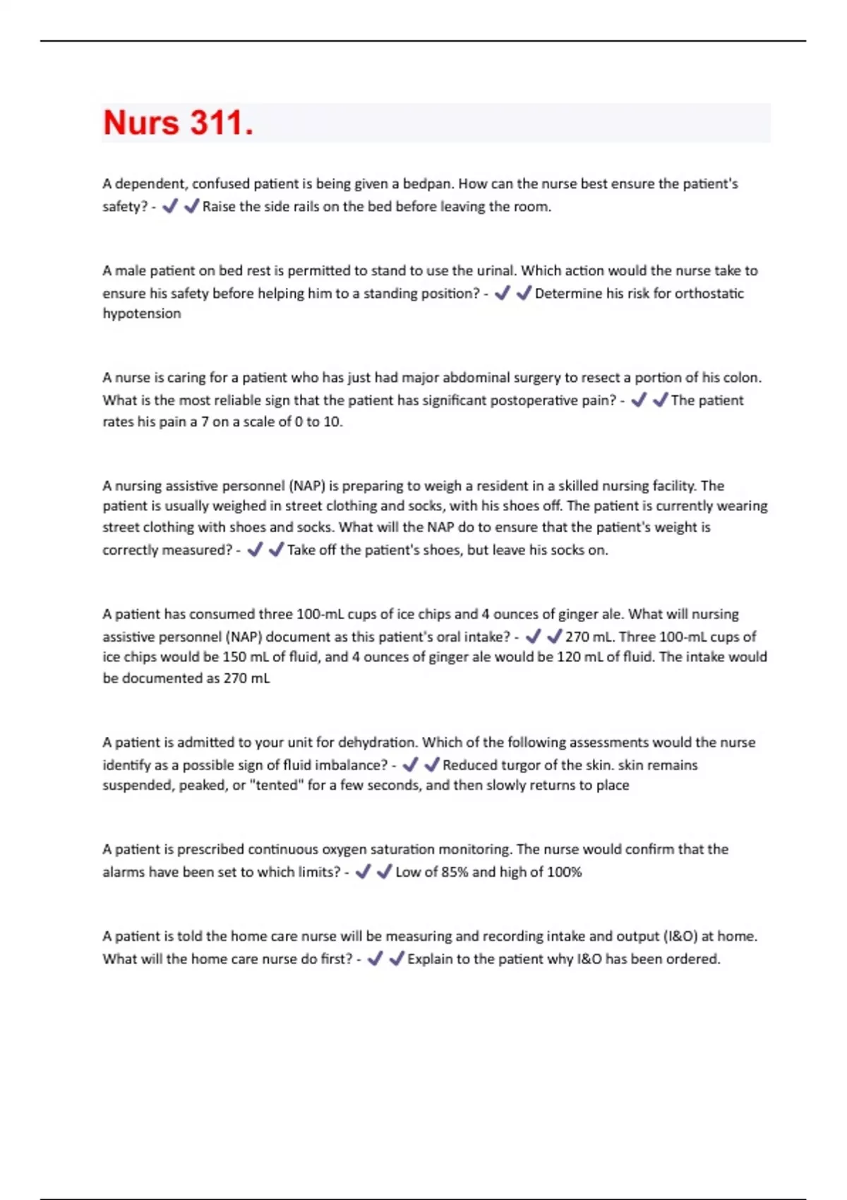A dependent, confused patient is being given a bedpan. How can the nurse best ensure the patient's safety? - Raise the side rails on the bed before leaving the room. A male patient on bed rest is permitted to stand to use the urinal. Which action would the nurse take to ensure his safety before helping him to a standing position? - Determine his risk for orthostatic hypotension A nurse is caring for a patient who has just had major abdominal surgery to resect a portion of his colon. What is the most reliable sign that the patient has significant postoperative pain? - The patient rates his pain a 7 on a scale of 0 to 10. A nursing assistive personnel (NAP) is preparing to weigh a resident in a skilled nursing facility. The patient is usually weighed in street clothing and socks, with his shoes off. The patient is currently wearing street clothing with shoes and socks. What will the NAP do to ensure that the patient's weight is correctly measured? - Take off the patient's shoes, but leave his socks on. A patient has consumed three 100-mL cups of ice chips and 4 ounces of ginger ale. What will nursing assistive personnel (NAP) document as this patient's oral intake? - 270 mL. Three 100-mL cups of ice chips would be 150 mL of fluid, and 4 ounces of ginger ale would be 120 mL of fluid. The intake would be documented as 270 mL A patient is admitted to your unit for dehydration. Which of the following assessments would the nurse identify as a possible sign of fluid imbalance? - Reduced turgor of the skin. skin remains suspended, peaked, or "tented" for a few seconds, and then slowly returns to place A patient is prescribed continuous oxygen saturation monitoring. The nurse would confirm that the alarms have been set to which limits? - Low of 85% and high of 100% A patient is told the home care nurse will be measuring and recording intake and output (I&O) at home. What will the home care nurse do first? - Explain to the patient why I&O has been ordered.A patient who weighs 200 lbs. needs to be moved up in bed with the aid of a friction-reducing device. The nurse will prepare for this move by assembling how many caregivers? - At least three A patient will be moved up in bed with the use of a friction-reducing device. How will the nurse place this device under the patient? - Roll the patient from side to side, and place the device under the drawsheet. A patient with a herniated disk is scheduled for surgery to fuse two vertebrae in her cervical spine. Which activity is most likely to be a palliative factor for this patient? - Performing neck, back, and shoulder exercises prescribed by a physical therapist A patient with a nasogastric tube, an intravenous infusion line, and an indwelling urinary catheter needs to be placed on the bedpan. Which action would the nurse take first to ensure the patient's safety? - Obtain help to place the patient on the bedpan. A patient with type 2 diabetes mellitus tells the nurse that he has been testing his own blood glucose level six times per day for the past 3 years. What is the most appropriate action for the nurse to take? - Observe the patient's testing technique for accuracy. It is useful to evaluate the patient's technique to ensure that he receives accurate results. After assisting with a bedpan, the nurse notes that the patient's stool is streaked with bright-red blood. What would the nurse do first? - Ask if the patient has a history of hemorrhoids. Asking whether the patient has a history of hemorrhoids is the most appropriate initial response, followed by documentation of the observation and notification of the patient's health care provider. After bacteria are cultured from a midstream urine specimen, what is accomplished by sensitivity testing? - Determines which antibiotic agent is most effective in killing the bacteria After determining the proper size stocking and assessing the patient's circulatory status, a nurse delegates the application of elastic stockings to nursing assistive personnel (NAP). The nurse discovers that the NAP has been using moisturizer on the patient's legs before applying the stockings. What is the best action by the nurse? - Instruct NAP to use a small amount of cornstarch or powder.