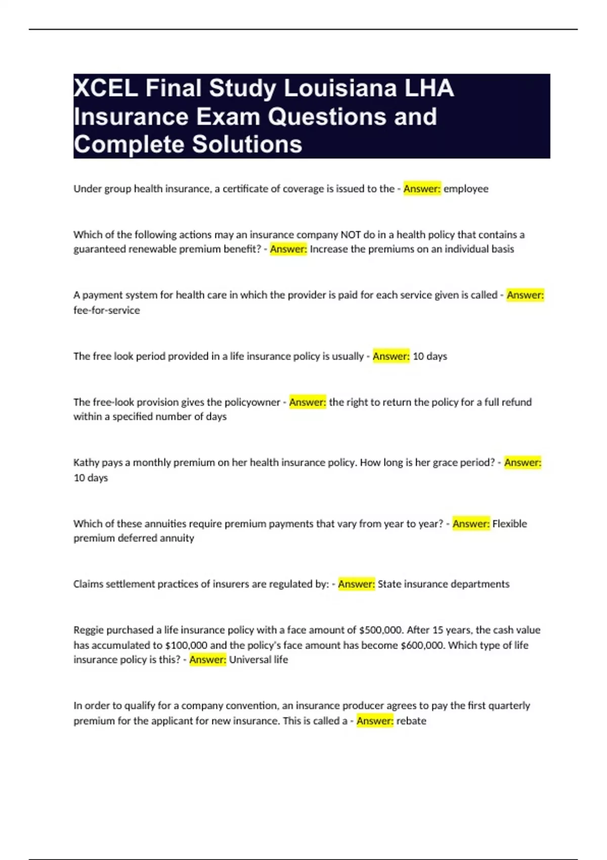 XCEL Final Study Louisiana LHA Insurance Exam Questions and Complete Solutions
