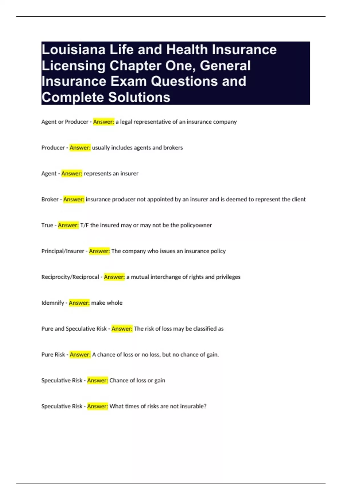 Louisiana Life and Health Insurance Licensing Chapter One, General Insurance Exam Questions and Complete Solutions