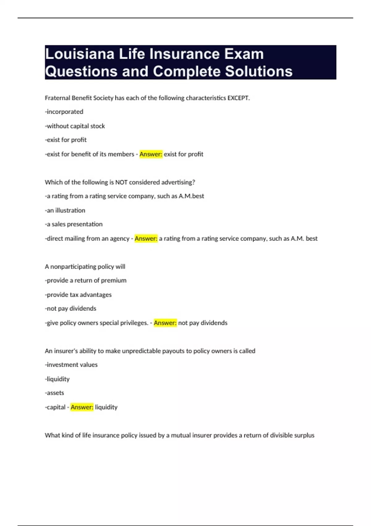 Louisiana Life Insurance Exam Questions and Complete Rationales