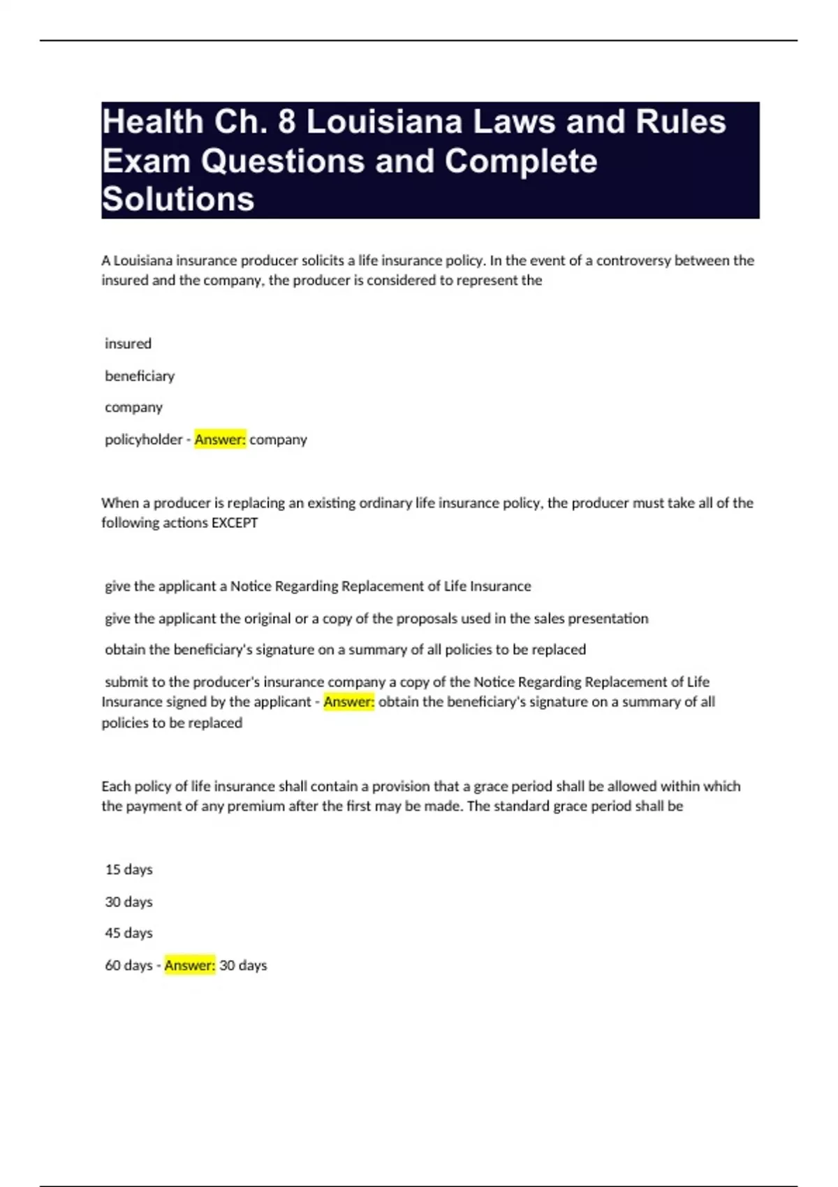 Health Ch. 8 Louisiana Laws and Rules Exam Questions and Complete Solutions