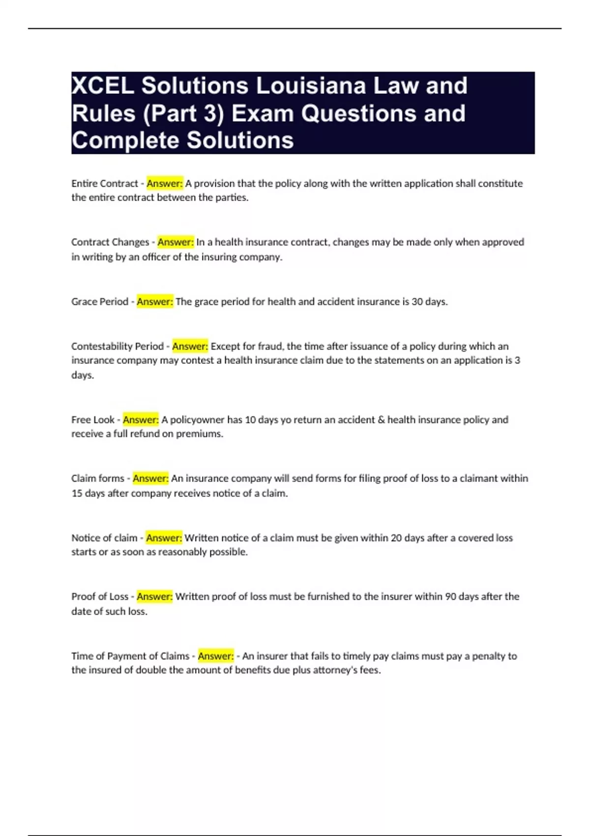 XCEL Solutions Louisiana Law and Rules (Part 3) Exam Questions and Complete Solutions.