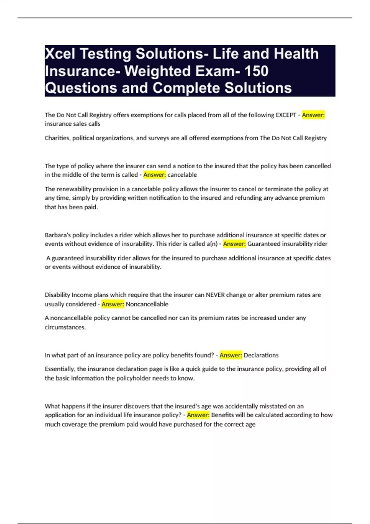 Xcel Testing Solutions- Life and Health Insurance- Weighted Exam- 150 Questions and Complete Solutions