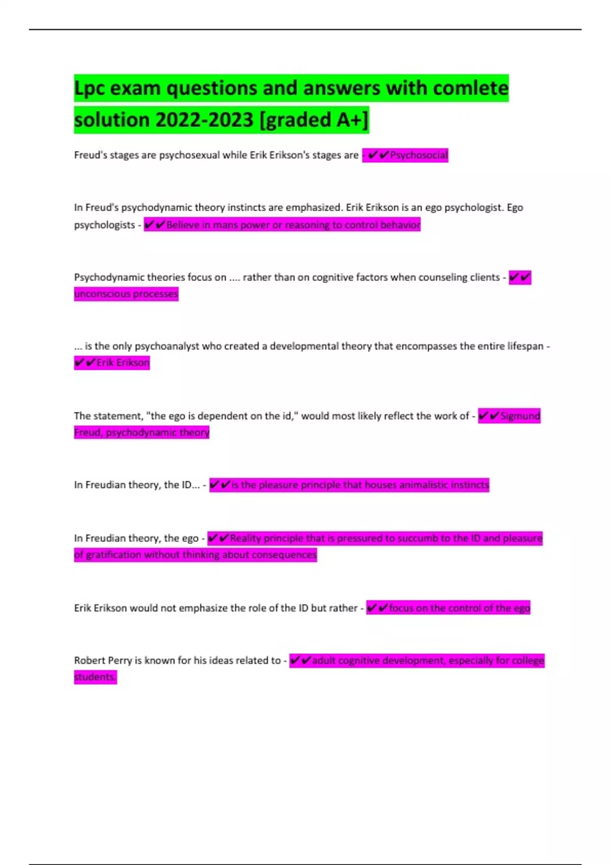 Freud's stages are psychosexual while Erik Erikson's stages are - Psychosocial In Freud's psychodynamic theory instincts are emphasized. Erik Erikson is an ego psychologist. Ego psychologists - Believe in mans power or reasoning to control behavior Psychodynamic theories focus on .... rather than on cognitive factors when counseling clients - unconscious processes ... is the only psychoanalyst who created a developmental theory that encompasses the entire lifespan - Erik Erikson The statement, "the ego is dependent on the id," would most likely reflect the work of - Sigmund Freud, psychodynamic theory In Freudian theory, the ID... - is the pleasure principle that houses animalistic instincts In Freudian theory, the ego - Reality principle that is pressured to succumb to the ID and pleasure of gratification without thinking about consequences Erik Erikson would not emphasize the role of the ID but rather - focus on the control of the ego Robert Perry is known for his ideas related to - adult cognitive development, especially for college students.