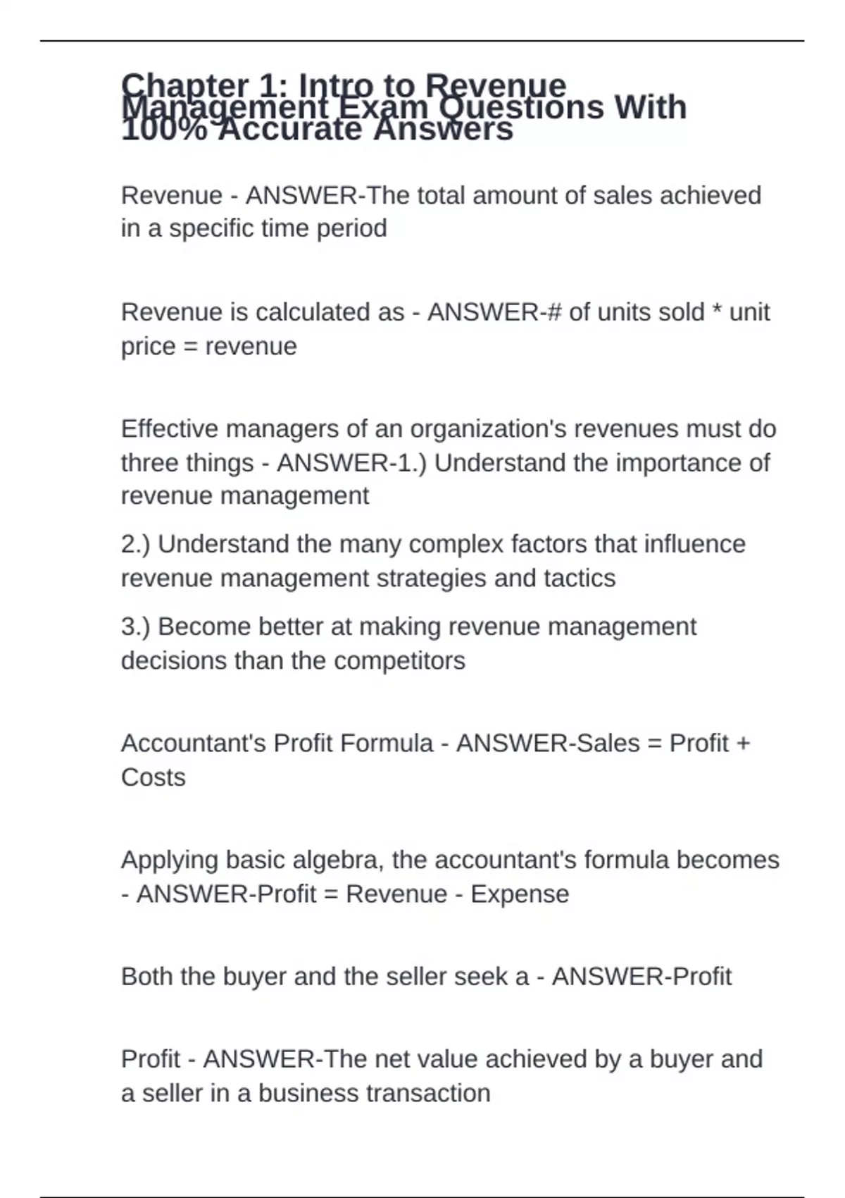 Revenue - ANSWER-The total amount of sales achieved in a specific time period Revenue is calculated as - ANSWER-# of units sold * unit price = revenue Effective managers of an organization's revenues must do three things - ANSWER-1.) Understand the importance of revenue management 2.) Understand the many complex factors that influence revenue management strategies and tactics 3.) Become better at making revenue management decisions than the competitors Accountant's Profit Formula - ANSWER-Sales = Profit + Costs Applying basic algebra, the accountant's formula becomes - ANSWER-Profit = Revenue - Expense Both the buyer and the seller seek a - ANSWER-Profit