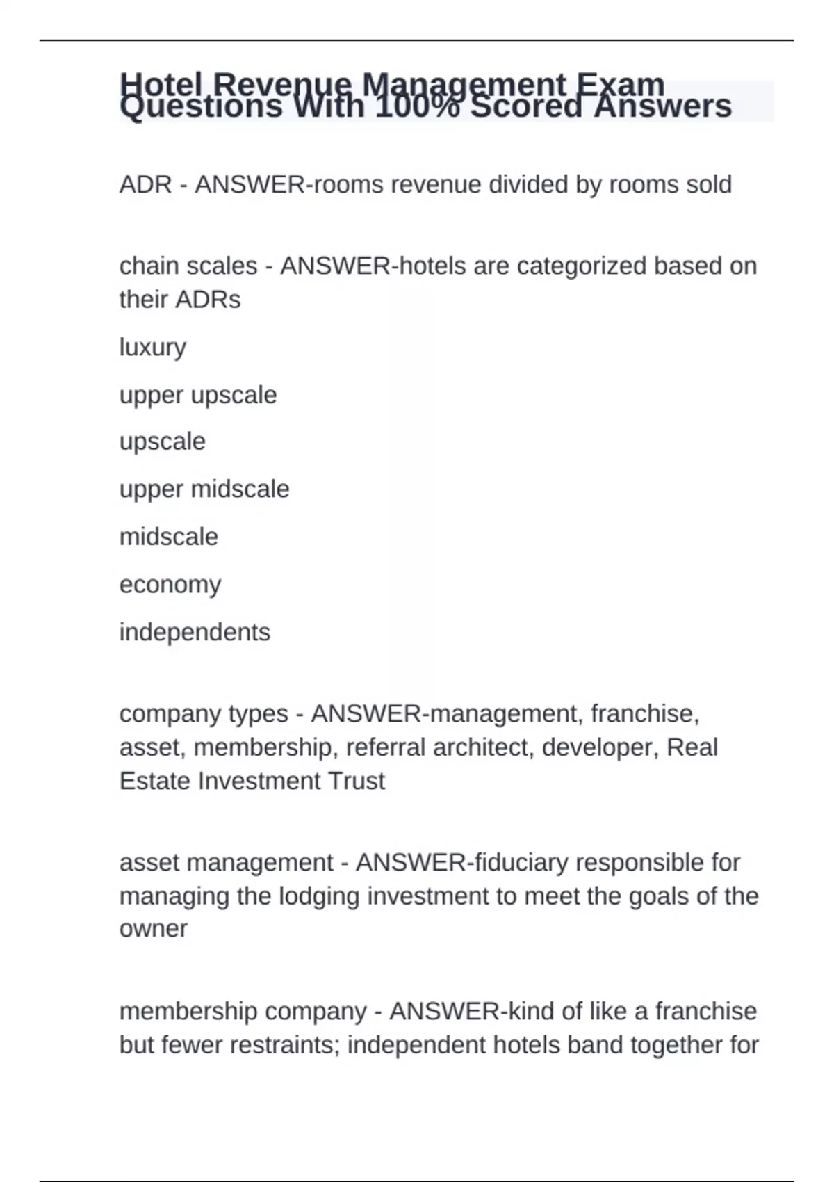 ADR - ANSWER-rooms revenue divided by rooms sold chain scales - ANSWER-hotels are categorized based on their ADRs luxury upper upscale upscale upper midscale midscale economy independents company types - ANSWER-management, franchise, asset, membership, referral architect, developer, Real Estate Investment Trust asset management - ANSWER-fiduciary responsible for managing the lodging investment to meet the goals of the owner