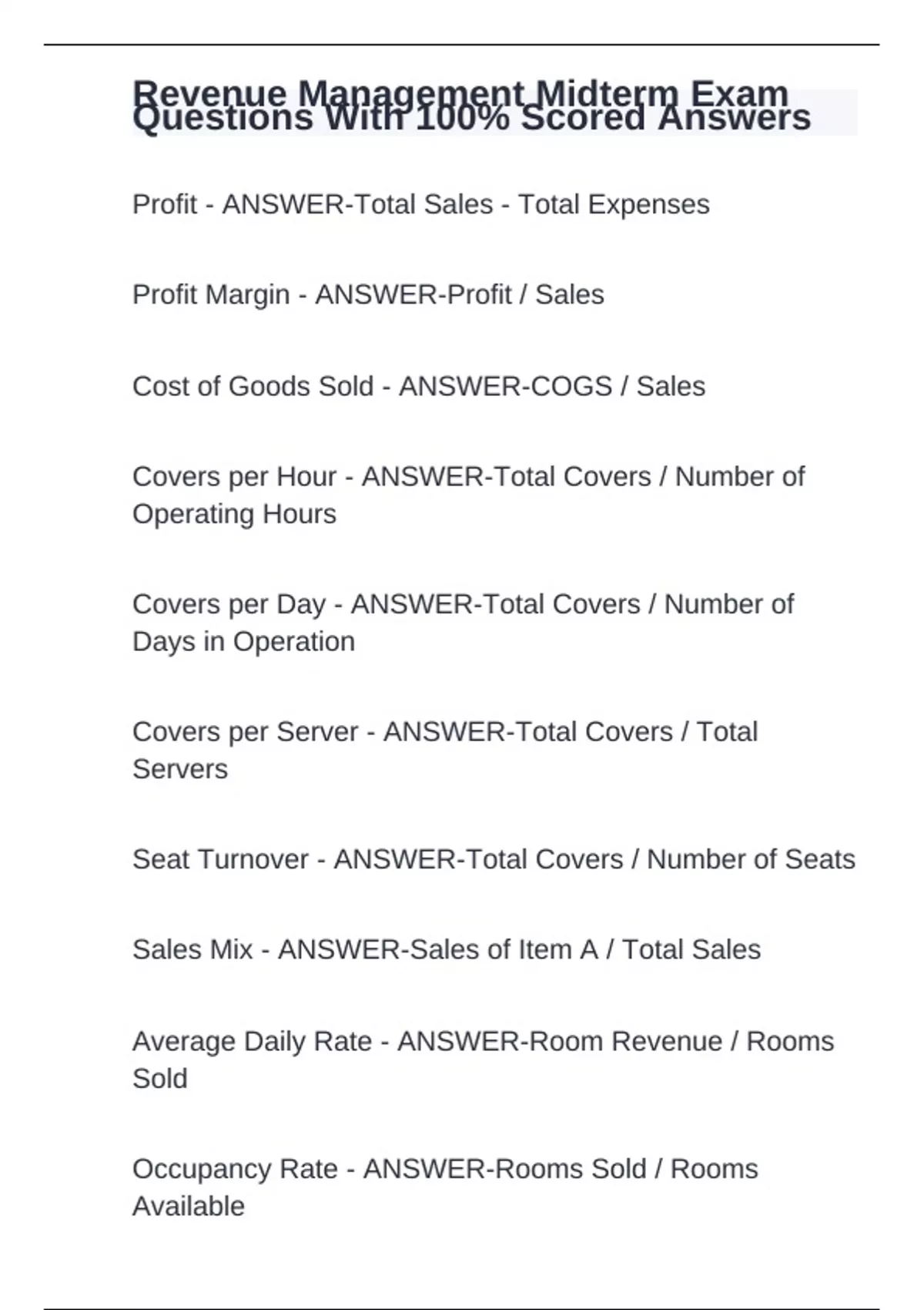 Profit - ANSWER-Total Sales - Total Expenses Profit Margin - ANSWER-Profit / Sales Cost of Goods Sold - ANSWER-COGS / Sales Covers per Hour - ANSWER-Total Covers / Number of Operating Hours Covers per Day - ANSWER-Total Covers / Number of Days in Operation Covers per Server - ANSWER-Total Covers / Total Servers Seat Turnover - ANSWER-Total Covers / Number of Seats Sales Mix - ANSWER-Sales of Item A / Total Sales