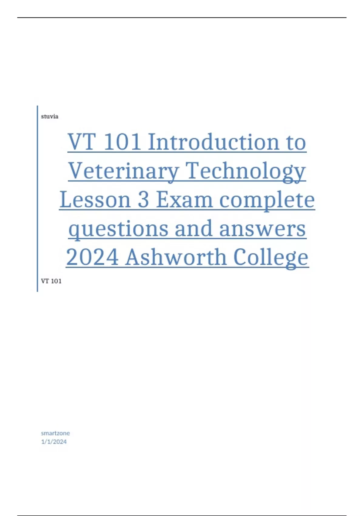 VT 101 Introduction to Veterinary Technology Lesson 3 Exam complete questions and answers 2024 Ashworth College