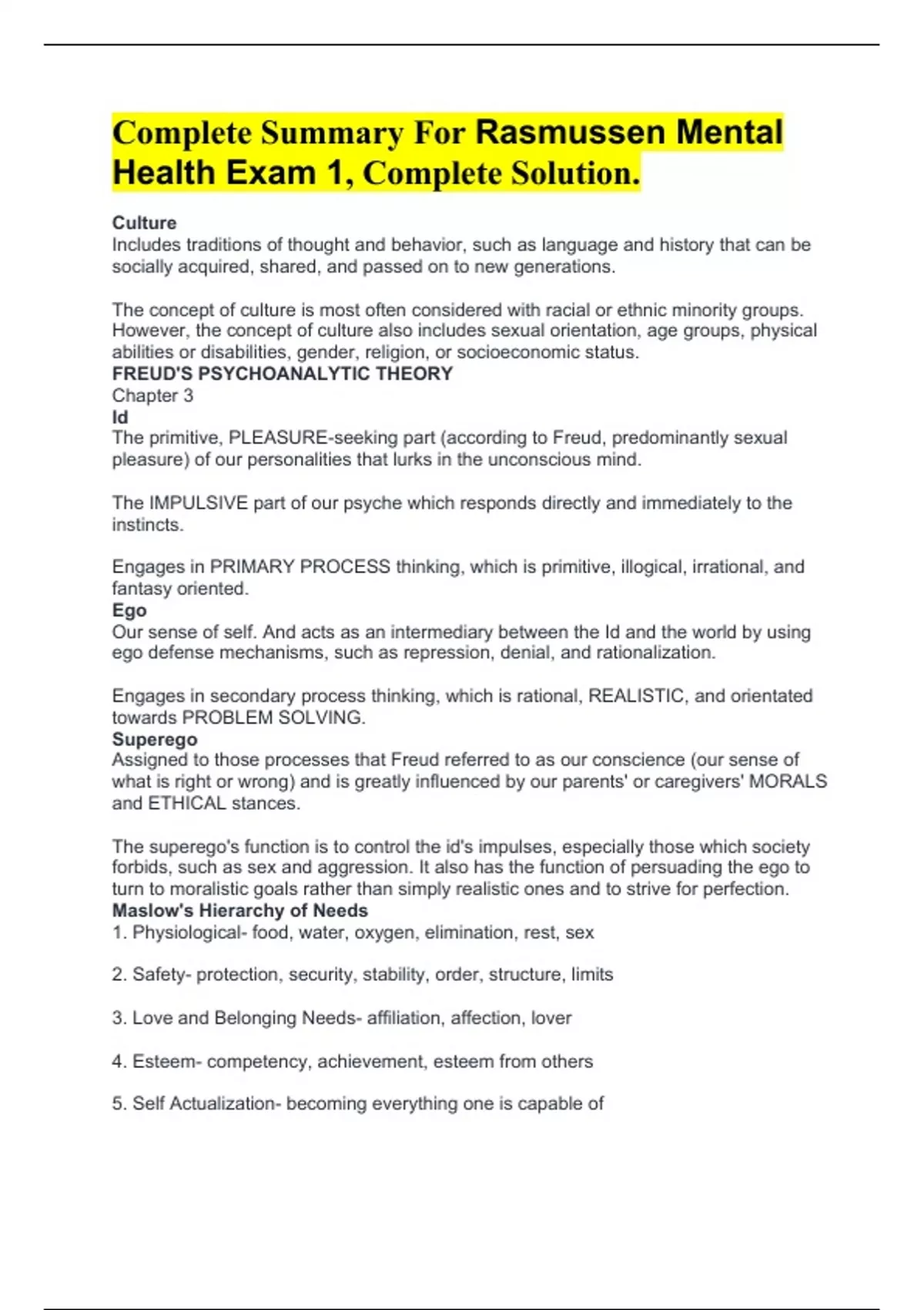 Complete Summary For Rasmussen Mental Health Exam 1, Complete Solution. Culture Includes traditions of thought and behavior, such as language and history that can be socially acquired, shared, and passed on to new generations. The concept of culture is most often considered with racial or ethnic minority groups. However, the concept of culture also includes sexual orientation, age groups, physical abilities or disabilities, gender, religion, or socioeconomic status. FREUD'S PSYCHOANALYTIC THEORY Chapter 3 Id The primitive, PLEASURE-seeking part (according to Freud, predominantly sexual pleasure) of our personalities that lurks in the unconscious mind. The IMPULSIVE part of our psyche which responds directly and immediately to the instincts. Engages in PRIMARY PROCESS thinking, which is primitive, illogical, irrational, and fantasy oriented. Ego Our sense of self. And acts as an intermediary between the Id and the world by using ego defense mechanisms, such as repression, denial, and rationalization. Engages in secondary process thinking, which is rational, REALISTIC, and orientated towards PROBLEM SOLVING. Superego Assigned to those processes that Freud referred to as our conscience (our sense of what is right or wrong) and is greatly influenced by our parents' or caregivers' MORALS and ETHICAL stances. The superego's function is to control the id's impulses, especially those which society forbids, such as sex and aggression. It also has the function of persuading the ego to turn to moralistic goals rather than simply realistic ones and to strive for perfection. Maslow's Hierarchy of Needs 1. Physiological- food, water, oxygen, elimination, rest, sex 2. Safety- protection, security, stability, order, structure, limits 3. Love and Belonging Needs- affiliation, affection, lover 4. Esteem- competency, achievement, esteem from others 5. Self Actualization- becoming everything one is capable of 6. Self Transcendent Needs - when an individual "seeks to further a cause beyond the self and to experience a communion beyond the boundaries of the self through peak experiences." Erickson's Stages of Development - Infant: Birth - 1.5 yrs old Trust vs. Mistrust Task: develop a basic sense of trust and comfort and minimal fear and uncertainty. Erickson's Stages of Development - Early childhood (toddler) - 1.5-3 yrs old Autonomy vs. Shame/doubt Task: gain self control and independence Erickson's Stages of Development - Preschooler 3-6 yrs old Initiative vs. Guilt Task: achieve sense of purpose and task mastery Erickson's Stages of Development - School age 6-12 yrs old Industry vs. Inferiority Task: self confidence thru learning and competition Erickson's Stages of Development - Adolescent 12-20 yrs old REMEMBER Identity vs. Role confusion Task: differentiation from parents leads to fidelity, integrate all the above for sense of self Erickson's Stages of Development - Young adult 20-30 yrs old REMEMBER Intimacy vs. isolation Task: form intense long term relationships Erickson's Stages of Development - Adult 30-65 yrs old REMEMBER Generativity vs. Self-absorption Task: achieve life goals and obtain concern for future generation Erickson's Stages of Development - Older adult 65+ Integrity vs. Despair Task: derive meaning from life and sense of self worth Neurotransmitters Chapter 4 Dopamine Functions: COGNITION MOTIVATION
