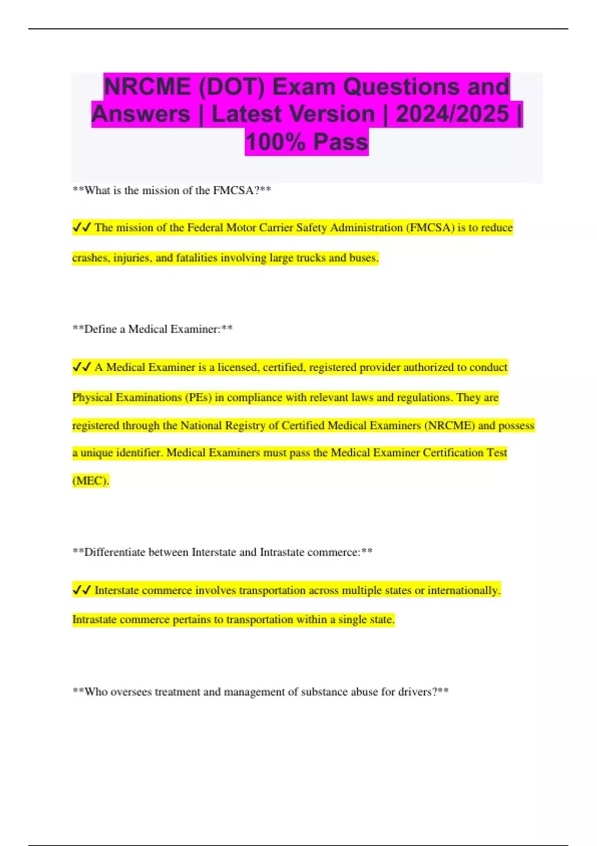 NRCME (DOT) Exam Questions and Answers | Latest Version | 2024/2025 | 100% Pass **What is the mission of the FMCSA?** The mission of the Federal Motor Carrier Safety Administration (FMCSA) is to reduce crashes, injuries, and fatalities involving large trucks and buses. **Define a Medical Examiner:** A Medical Examiner is a licensed, certified, registered provider authorized to conduct Physical Examinations (PEs) in compliance with relevant laws and regulations. They are registered through the National Registry of Certified Medical Examiners (NRCME) and possess a unique identifier. Medical Examiners must pass the Medical Examiner Certification Test (MEC). **Differentiate between Interstate and Intrastate commerce:** Interstate commerce involves transportation across multiple states or internationally. Intrastate commerce pertains to transportation within a single state. **Who oversees treatment and management of substance abuse for drivers?** Substance Abuse Professionals (SAPs) are responsible for regulating the treatment and aftercare of substance abuse for drivers. **Who determines the cause of abnormal drug test results for drivers?** Medical Review Officers (MROs) determine the origin of abnormal drug test results, assessing whether drivers have violated drug use regulations. **What does Title 49 CFR 391.41 pertain to?** Title 49 CFR 391.41 focuses on the Medical Examiner Report Form, which is completed during the Department of Transportation (DOT) physical examination. It outlines the requirements and procedures for granting medical certification to drivers. **Describe the significance of Title 49 CFR 391.43:** Title 49 CFR 391.43 specifies the responsibilities of Medical Examiners, provides instructions for conducting examinations, and outlines the requirements for medical certification. It serves as supporting information for understanding CFR 391.41. **When was the Department of Transportation (DOT) established?** The DOT was established in 1966 and became a separate federal entity on January 1, 2000. **What legislation established the DOT as a separate federal entity?** The Motor Carrier Safety Improvement Act of 1999 established the DOT as a distinct federal agency. **What was mandated by the Omnibus Transportation Employee Testing Act of 1991?** The Omnibus Transportation Employee Testing Act of 1991 mandated drug testing requirements for drivers. **What document must drivers keep with them while driving?** Drivers must always carry a copy of their Medical Certificate, especially if applicable, their Skill Performance Evaluation (SPE). **Is a driver required to sign a medical release before their Medical Certification is released?** No, the Medical Certification is provided directly to the employer. A release is required only for a copy of the medical report form. How many standards are used to determine driver fitness for duty? 13 How many standards of "driver fitness for duty" are *discretionary*? 9 (according to my review course) - Other sources say 10 and say that T2DM is discretionary How many standards of "driver fitness for duty" are *NON- discretionary*? 4 - Vision - Hearing - Epilepsy - T2DM (Some sources say 3 and do not include T2DM) Age requirement for drivers 21+ Language requirement for drivers Must be able to read/speak
