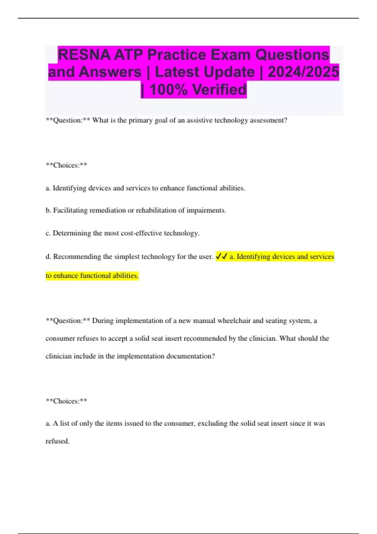 RESNA ATP Practice Exam Questions and Answers | Latest Update | 2024/2025 | 100% Verified **Question:** What is the primary goal of an assistive technology assessment? **Choices:** a. Identifying devices and services to enhance functional abilities. b. Facilitating remediation or rehabilitation of impairments. c. Determining the most cost-effective technology. d. Recommending the simplest technology for the user. a. Identifying devices and services to enhance functional abilities. **Question:** During implementation of a new manual wheelchair and seating system, a consumer refuses to accept a solid seat insert recommended by the clinician. What should the clinician include in the implementation documentation? **Choices:** a. A list of only the items issued to the consumer, excluding the solid seat insert since it was refused. b. A list of all originally recommended items, including the solid seat insert approved for funding. c. A comprehensive list of all recommended items, highlighting the benefits of the solid seat insert. d. A list of issued items with a note that the client declined installation of the solid seat insert. d. A list of issued items with a note that the client declined installation of the solid seat insert. Which of the following instruments is commonly used to assess mobility status in older adults? a. Katz index of ADL b. thomas test for hip range c. Functional Independence Measure (FIM) d. multilevel assessment instrument c. Functional independence measure (FIM) A supplier and school PT completed an eval for a w/c system for a student prior to the end of the school year. It was purchased through private insurance and ordered during summer break. The PT requested that she be present when the w/c is delivered. During the summer, when the therapist is away, the student's family asks for the supplier to deliver the w/c immediately. The supplier should: a. comply w the family & deliver the chair b. set up a first fitting w the family c. call the PT and tell her the family is requesting delivery d. tell the family that they must wait until the beginning of the next school year for delivery c. call the PT and tell her the family requesting delivery Manufacturers of commercially available products are responsible for which of the follow a. product defects and warranty b. failures from wear and use c. personal injury when the device is used in a manner it was not designed for d. product use through the user's lifetime a. product defects and warranty A follow-up program is necessary over the first several months after delivery of an AT device because a. most devices fail within the first year of use b. maintenance issues need to be addressed to ensure the device works properly c. most consumers need modifications in the first few months due to worsening of their conditions d. extended use of devices may reveal additional training needs or modification opportunities d. extended use of devices may reveal additional