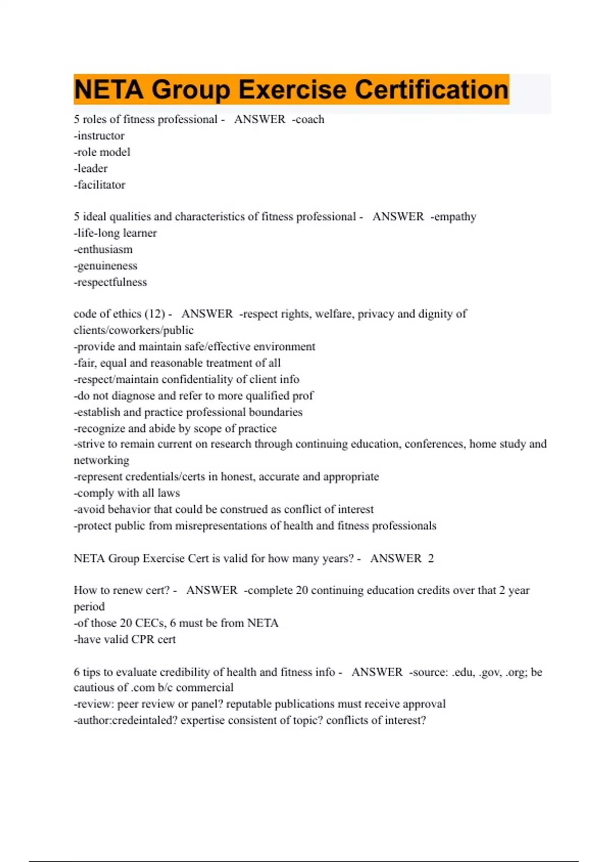 NETA Group Exercise Certification exam Questions with 100% CORRECT ANSWERS LATEST 2024(A+ GRADED VERIFIED BY EXPERTS)