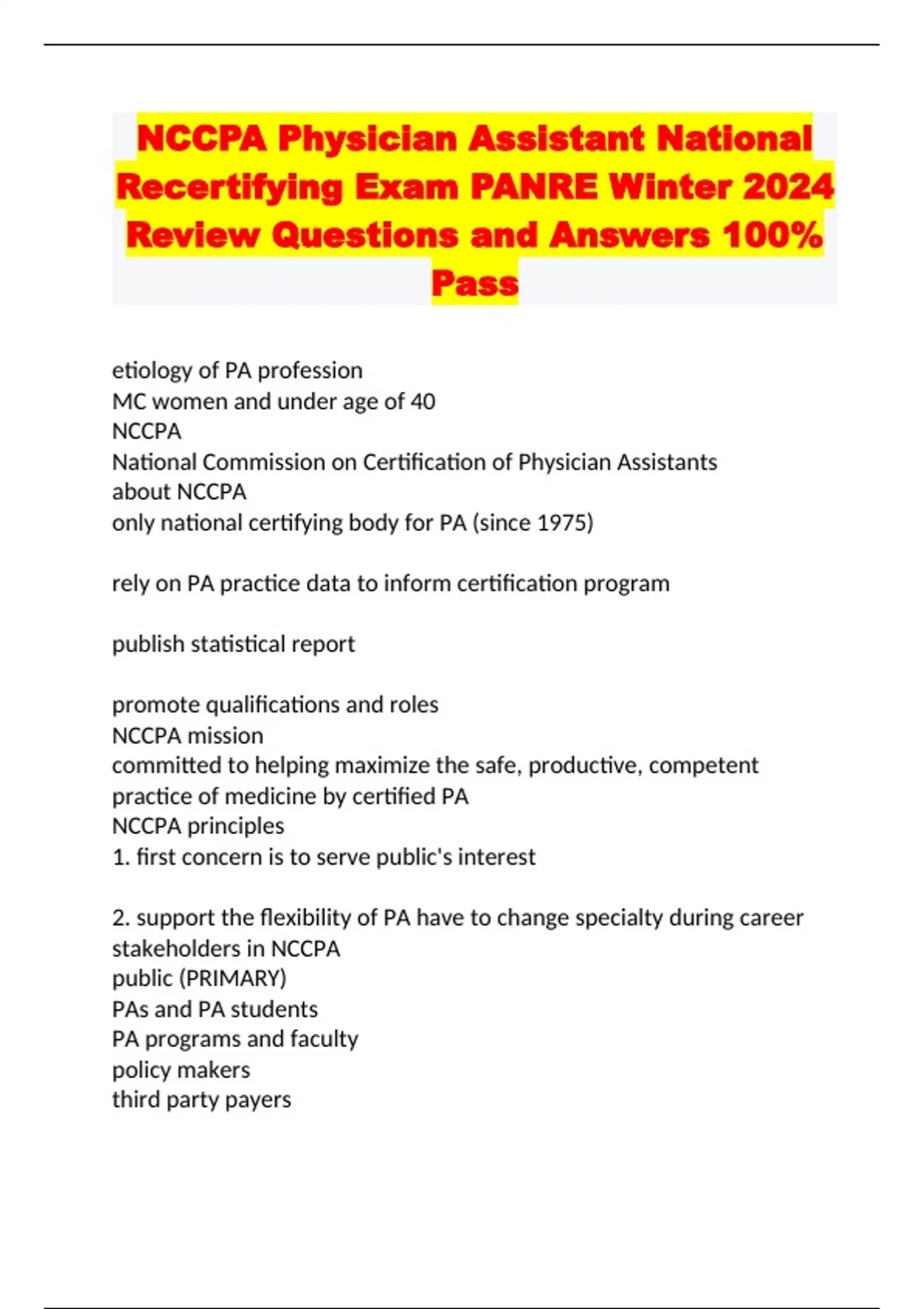 NCCPA Physician Assistant National Recertifying Exam PANRE Winter 2024 Review Questions and Answers 100% Pass
