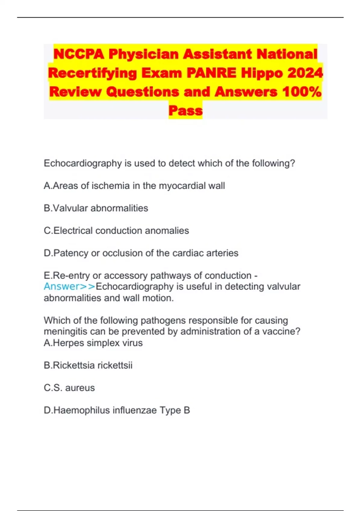 NCCPA Physician Assistant National Recertifying Exam PANRE Hippo 2024 Review Questions and Answers 100% Pass