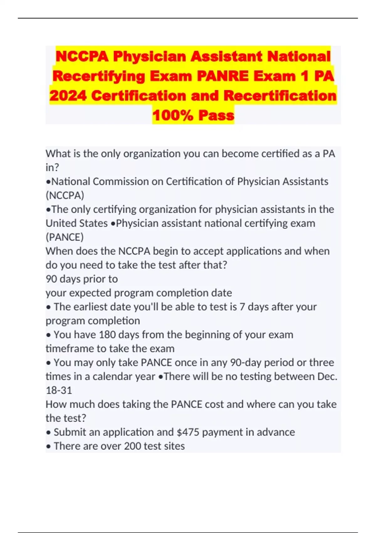 NCCPA Physician Assistant National Recertifying Exam PANRE Exam 1 PA 2024 Certification and Recertification 100% Pass