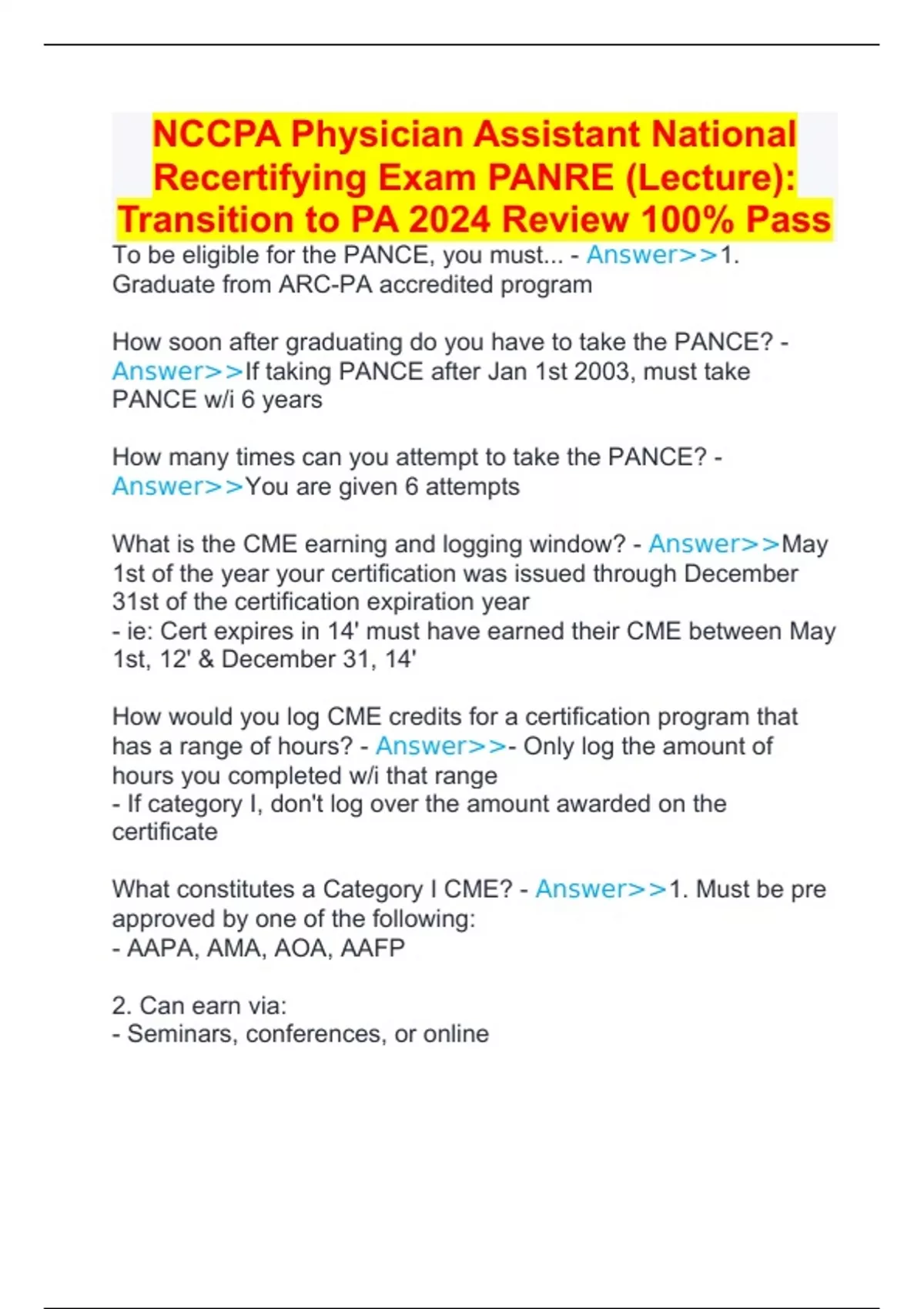 NCCPA Physician Assistant National Recertifying Exam PANRE (Lecture): Transition to PA 2024 Review 100% Pass