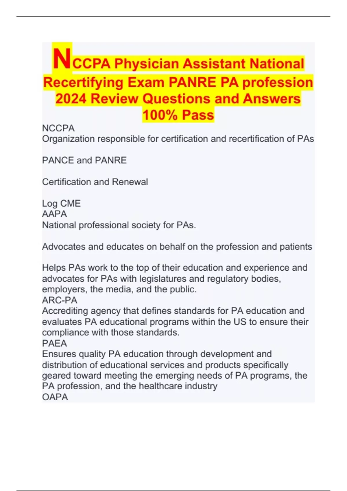 NCCPA Physician Assistant National Recertifying Exam PANRE PA profession 2024 Review Questions and Answers 100% Pass