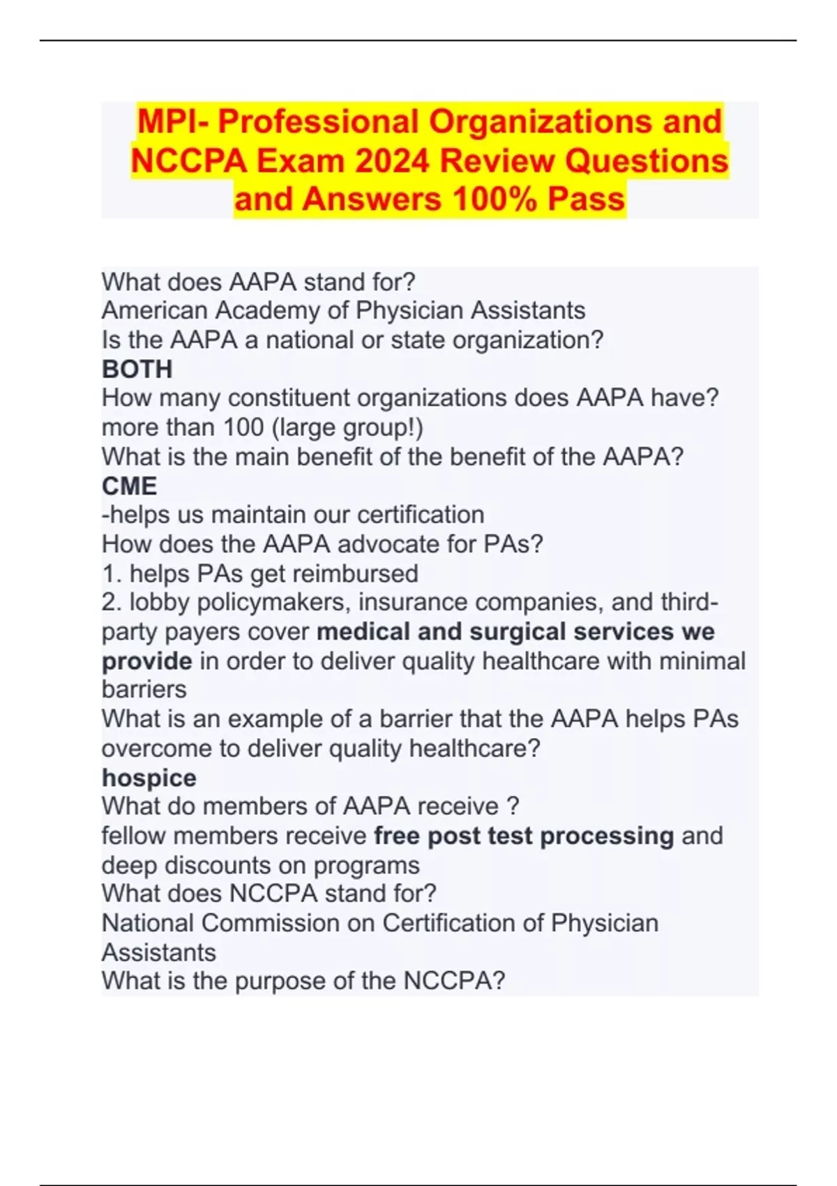 MPI- Professional Organizations and NCCPA Exam 2024 Review Questions and Answers 100% Pass
