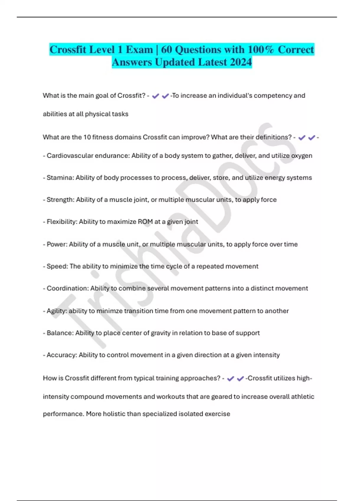 Crossfit Level 1 Exam | 60 Questions with 100% Correct Answers Updated Latest 2024 What is the main goal of Crossfit? - -To increase an individual's competency and abilities at all physical tasks What are the 10 fitness domains Crossfit can improve? What are their definitions? - - - Cardiovascular endurance: Ability of a body system to gather, deliver, and utilize oxygen - Stamina: Ability of body processes to process, deliver, store, and utilize energy systems - Strength: Ability of a muscle joint, or multiple muscular units, to apply force - Flexibility: Ability to maximize ROM at a given joint - Power: Ability of a muscle unit, or multiple muscular units, to apply force over time - Speed: The ability to minimize the time cycle of a repeated movement - Coordination: Ability to combine several movement patterns into a distinct movement - Agility: ability to minimze transition time from one movement pattern to another - Balance: Ability to place center of gravity in relation to base of support - Accuracy: Ability to control movement in a given direction at a given intensity How is Crossfit different from typical training approaches? - -Crossfit utilizes high- intensity compound movements and workouts that are geared to increase overall athletic performance. More holistic than specialize
