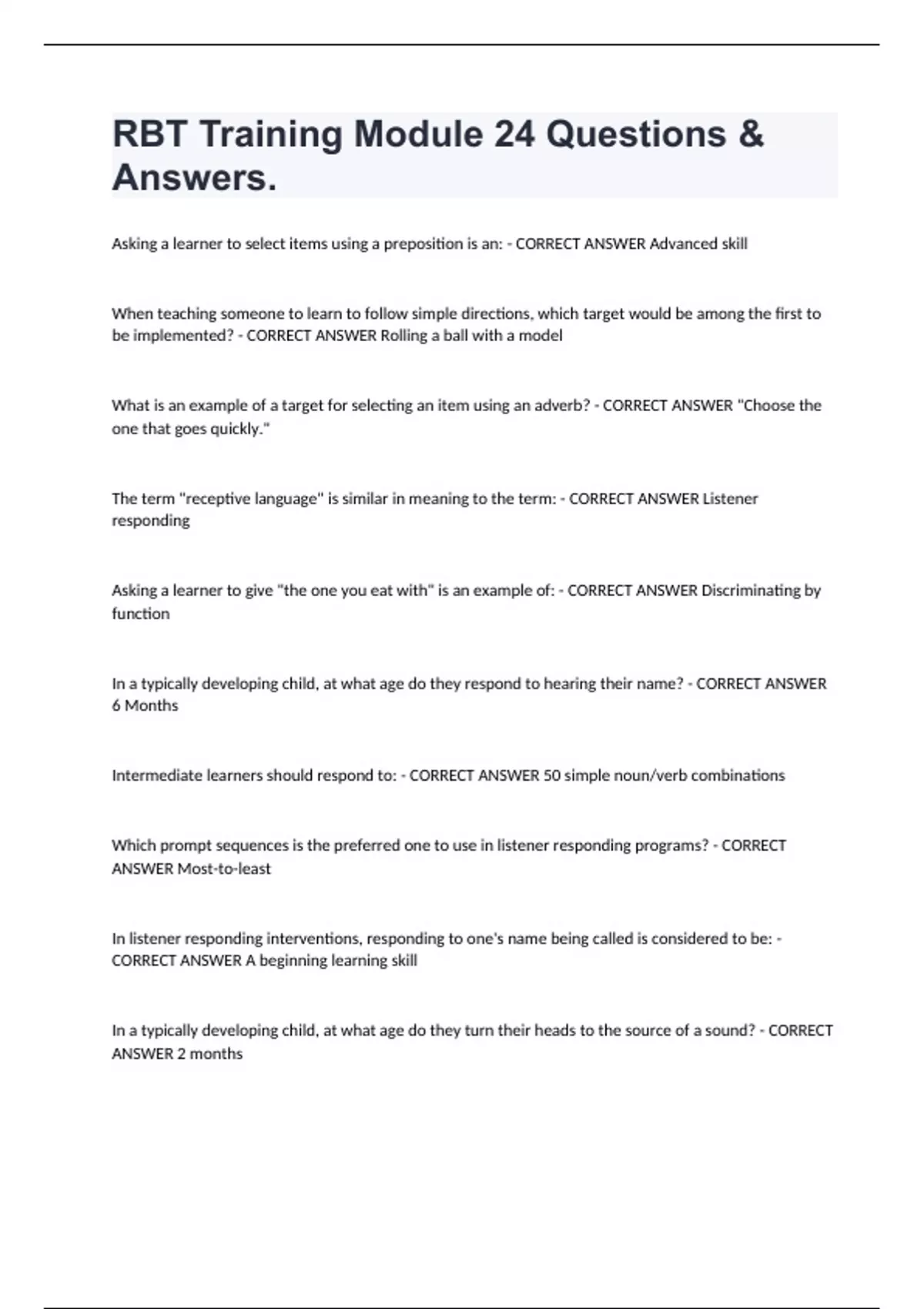 RBT Training Module 24 Questions & Answers. Asking a learner to select items using a preposition is an: - CORRECT ANSWER Advanced skill When teaching someone to learn to follow simple directions, which target would be among the first to be implemented? - CORRECT ANSWER Rolling a ball with a model What is an example of a target for selecting an item using an adverb? - CORRECT ANSWER "Choose the one that goes quickly." The term "receptive language" is similar in meaning to the term: - CORRECT ANSWER Listener responding Asking a learner to give "the one you eat with" is an example of: - CORRECT ANSWER Discriminating by function In a typically developing child, at what age do they respond to hearing their name? - CORRECT ANSWER 6 Months Intermediate learners should respond to: - CORRECT ANSWER 50 simple noun/verb combinations Which prompt sequences is the preferred one to use in listener responding programs? - CORRECT ANSWER Most-to-least