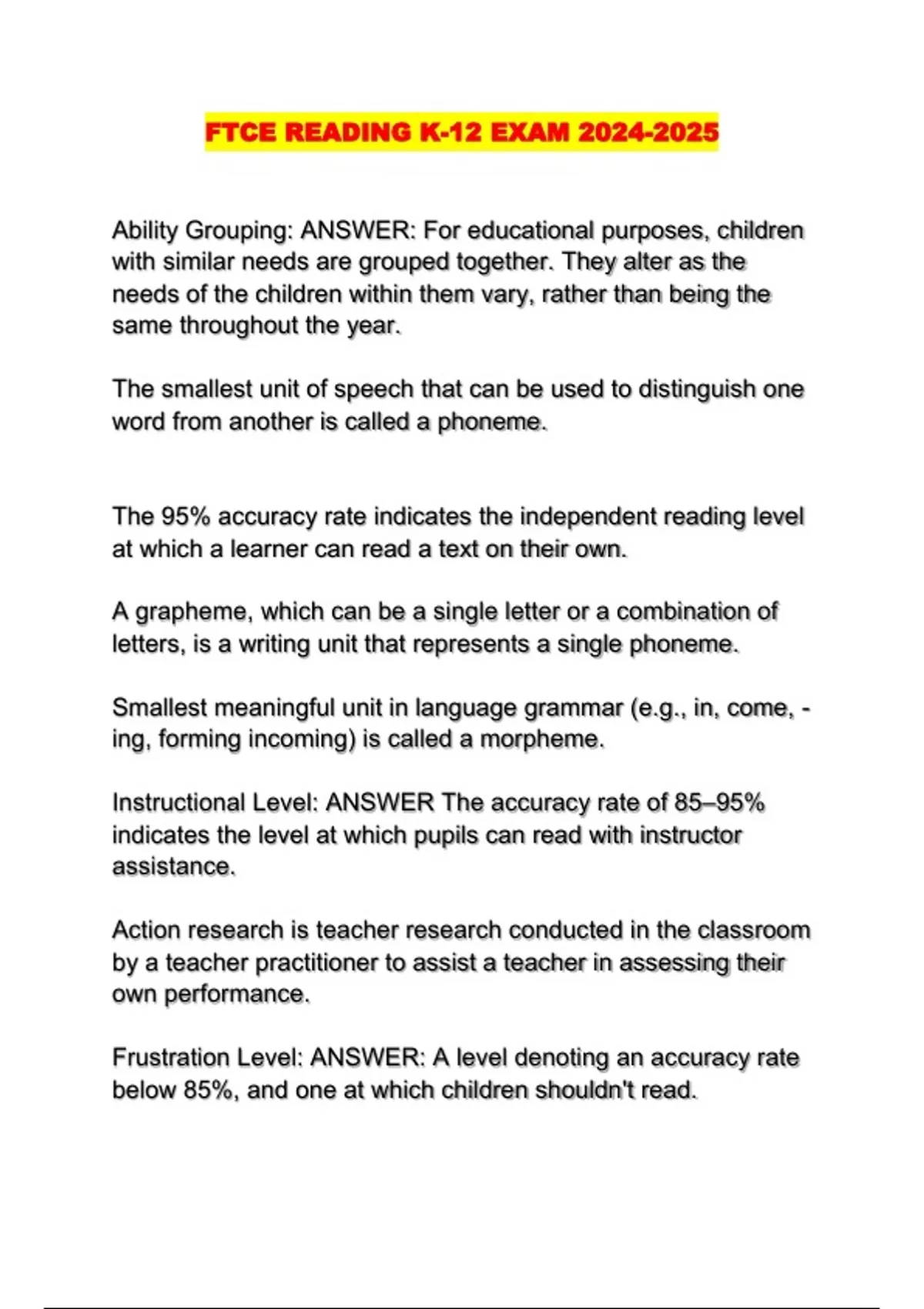 FTCE REA DING K-12 EXAM 2024-2025 Ability Grouping: ANSWER: For educational purposes, children with similar needs are grouped together. They alter as the needs of the children within them vary, rather than being the same throughout the year. The smallest unit of speech that can be used to distinguish one word from another is called a phoneme. The 95% accuracy rate indicates the independent reading level at which a learner can read a text on their own. A grapheme, which can be a single letter or a combination of letters, is a writing unit that represents a single phoneme. Smallest meaningful unit in language grammar (e.g., in, come, -