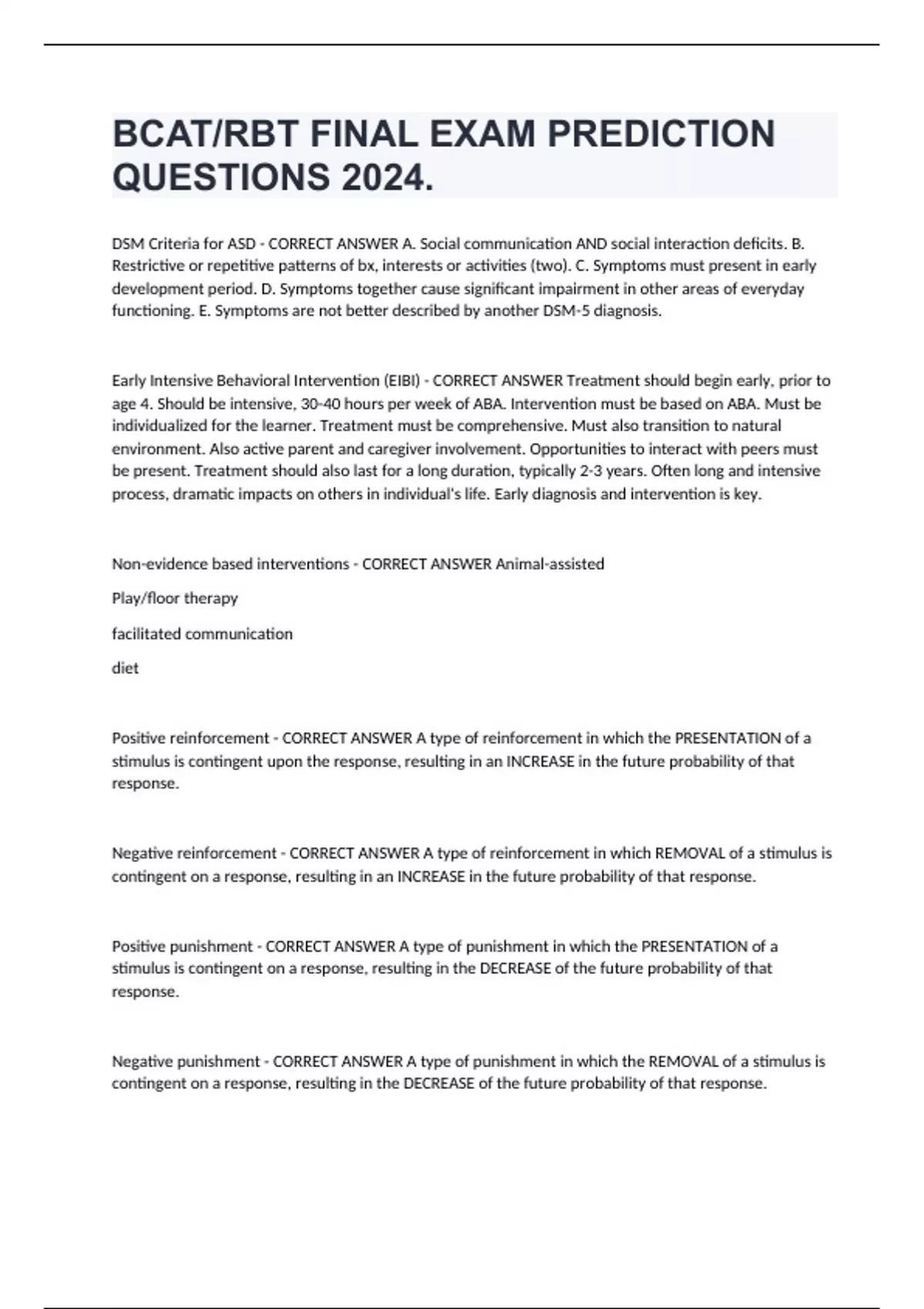 BCAT/RBT FINAL EXAM PREDICTION QUESTIONS 2024. DSM Criteria for ASD - CORRECT ANSWER A. Social communication AND social interaction deficits. B. Restrictive or repetitive patterns of bx, interests or activities (two). C. Symptoms must present in early development period. D. Symptoms together cause significant impairment in other areas of everyday functioning. E. Symptoms are not better described by another DSM-5 diagnosis. Early Intensive Behavioral Intervention (EIBI) - CORRECT ANSWER Treatment should begin early, prior to age 4. Should be intensive, 30-40 hours per week of ABA. Intervention must be based on ABA. Must be individualized for the learner. Treatment must be comprehensive. Must also transition to natural environment. Also active parent and caregiver involvement. Opportunities to interact with peers must be present. Treatment should also last for a long duration, typically 2-3 years. Often long and intensive process, dramatic impacts on others in individual's life. Early diagnosis and intervention is key. Non-evidence based interventions - CORRECT ANSWER Animal-assisted Play/floor therapy facilitated communication diet Positive reinforcement - CORRECT ANSWER A type of reinforcement in which the PRESENTATION of a stimulus is contingent upon the response, resulting in an INCREASE in the future probability of that response. Negative reinforcement - CORRECT ANSWER A type of reinforcement in which REMOVAL of a stimulus is contingent on a response, resulting in an INCREASE in the future probability of that response. Positive punishment - CORRECT ANSWER A type of punishment in which the PRESENTATION of a stimulus is contingent on a response, resulting in the DECREASE of the future probability of that response. Negative punishment - CORRECT ANSWER A type of punishment in which the REMOVAL of a stimulus is contingent on a response, resulting in the DECREASE of the future probability of that response.