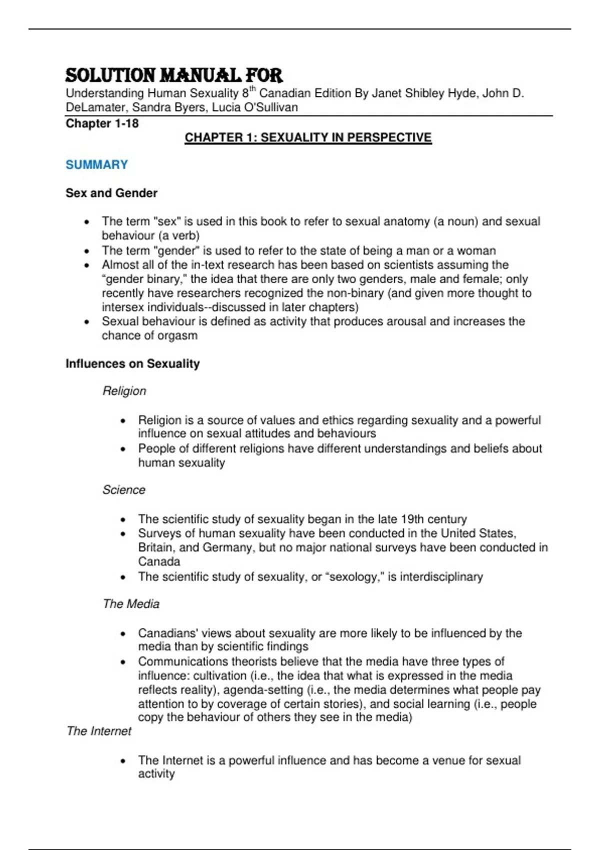 Solution Manual For Understanding Human Sexuality 8th Canadian Edition By Janet Shibley Hyde, John D. DeLamater, Sandra Byers, Lucia O'Sullivan Chapter 1-18