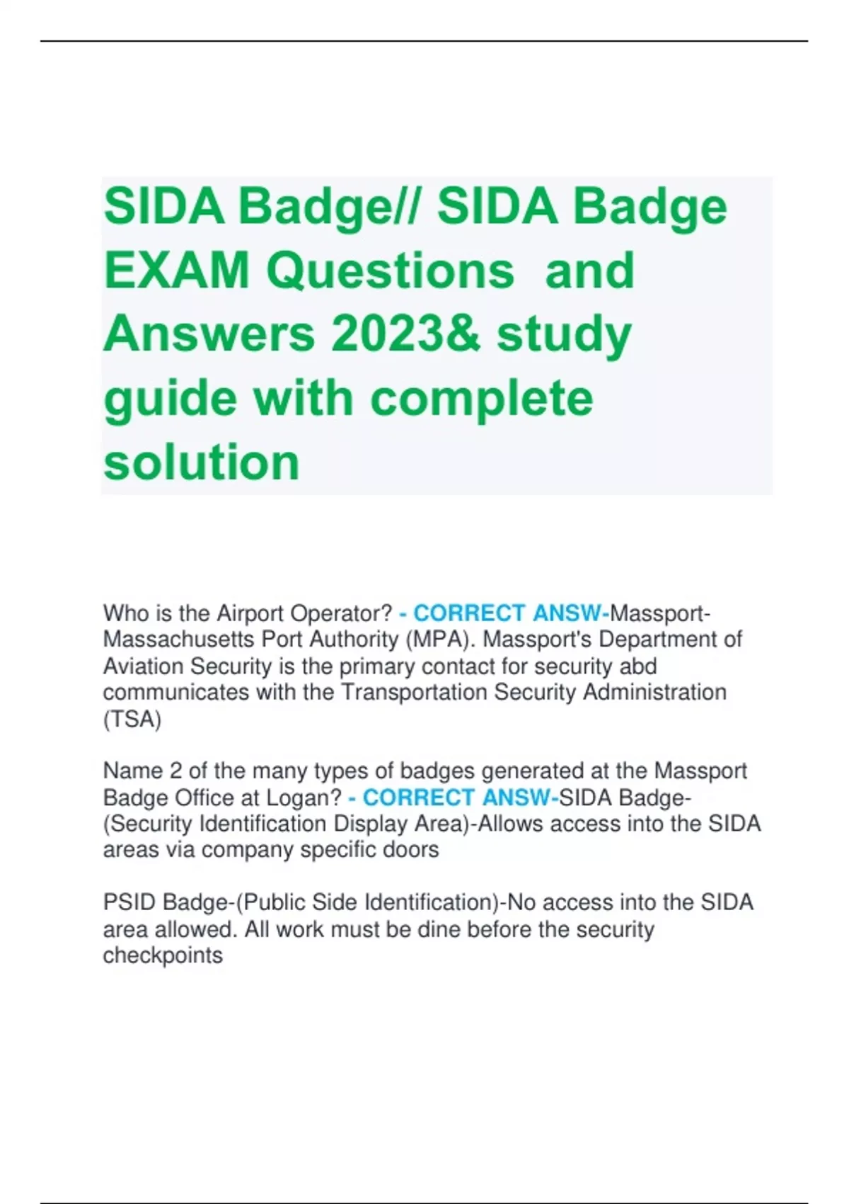 SIDA Badge// SIDA Badge EXAM Questions and Answers 2023& study guide with complete solution Who is the Airport Operator? - CORRECT ANSW-MassportMassachusetts Port Authority (MPA). Massport's Department of Aviation Security is the primary contact for security abd communicates with the Transportation Security Administration (TSA) Name 2 of the many types of badges generated at the Massport Badge Office at Logan? - CORRECT ANSW-SIDA Badge- (Security Identification Display Area)-Allows access into the SIDA areas via company specific doors PSID Badge-(Public Side Identification)-No access into the SIDA area allowed. All work must be dine before the security checkpoints TVP-(Temporary Visitor Pass)-Person must be under escort at all times beyond the security checkpoints and can be in the same areas as the escort and use the same doors as the escort Name 2 of the important phine numbers in the back of your badge - CORRECT ANSW-Massport ops/door alarms State police main number Massport medical emergency What does SIDA stand for? - CORRECT ANSW-Security Identification Display Area Where and when must you wear your badge? - CORRECT ANSW-Outermost garment Reasily visible Between the neck and waist At all times in the SIDA area (beyond the security checkpoints) Nane 3 organizations and/or people involved in the security of Logan Airport - CORRECT ANSW-You, the employee State Police Massport TSA All companies (tenants and contractors) doing business at Logan What should you do if you see an unattended or suspicious item on the airport grounds? - CORRECT ANSW-Do not touch it Immediately call Massport Operations or State Police Contact your Badge coordinator to begin the process for obtaining a new badge