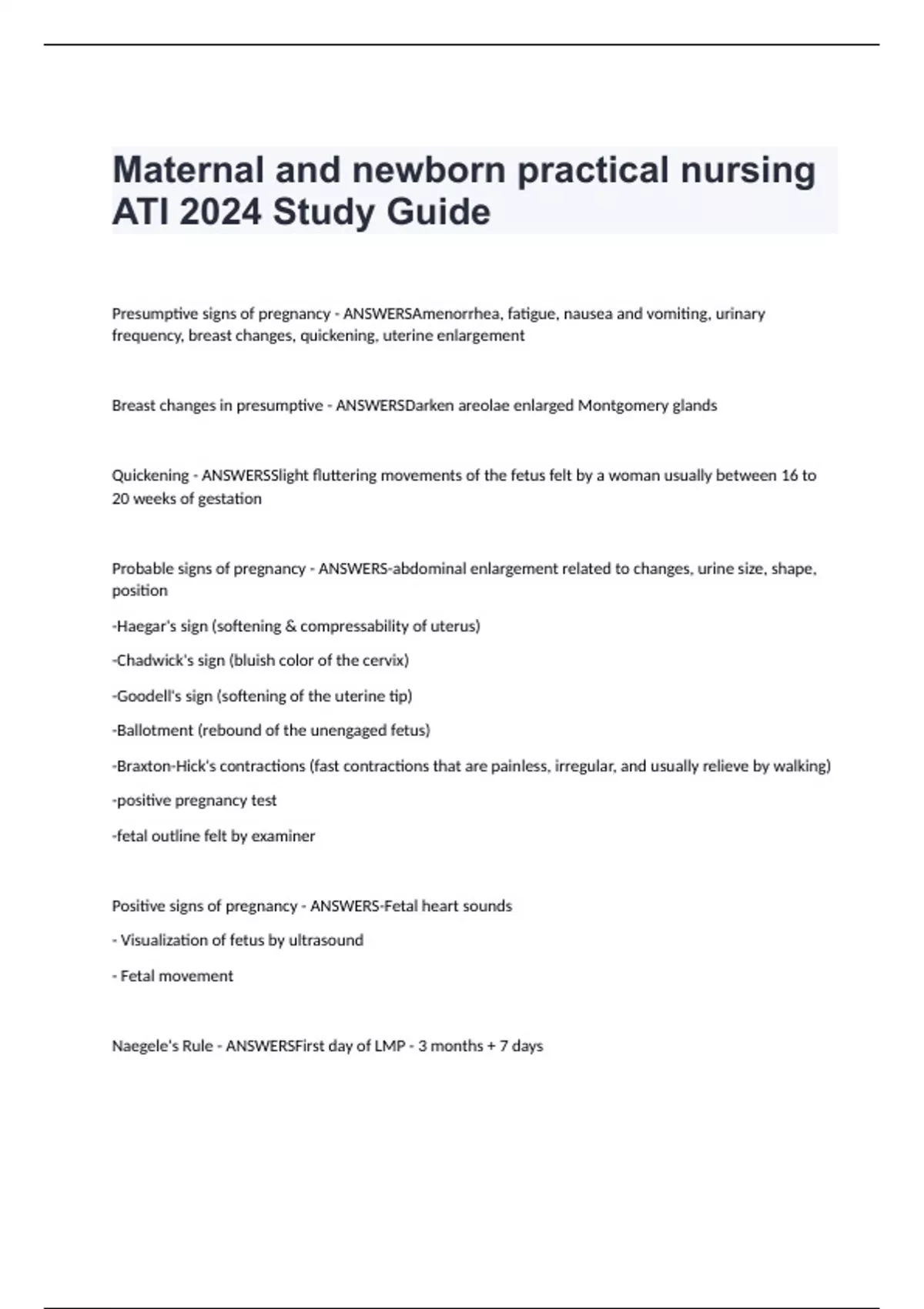 Maternal and newborn practical nursing ATI 2024 Study Guide Presumptive signs of pregnancy - ANSWERSAmenorrhea, fatigue, nausea and vomiting, urinary frequency, breast changes, quickening, uterine enlargement Breast changes in presumptive - ANSWERSDark