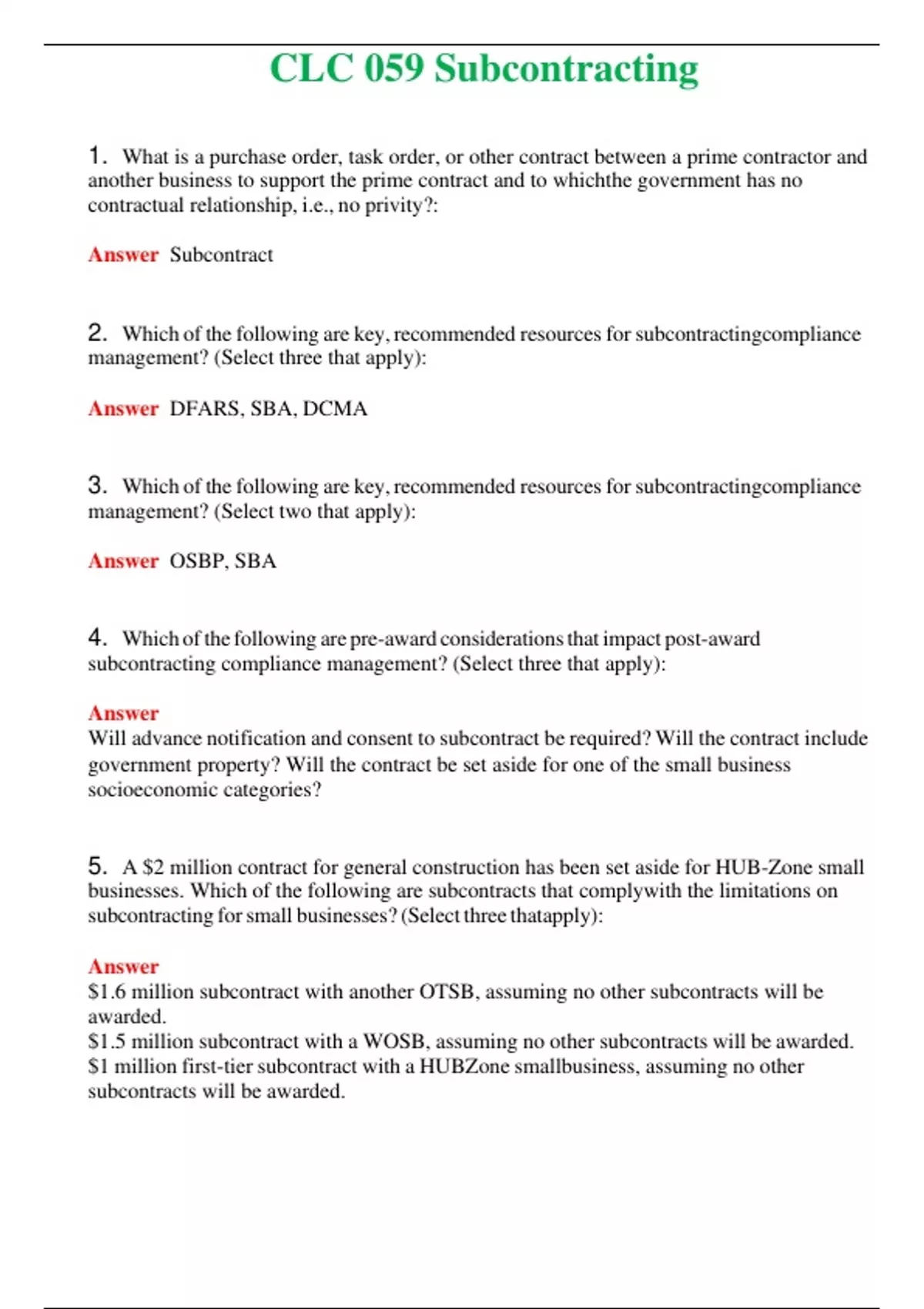 2024 CLC 059 Subcontracting | Actual Questions and Verified Answers ( Included ) 100% Correct