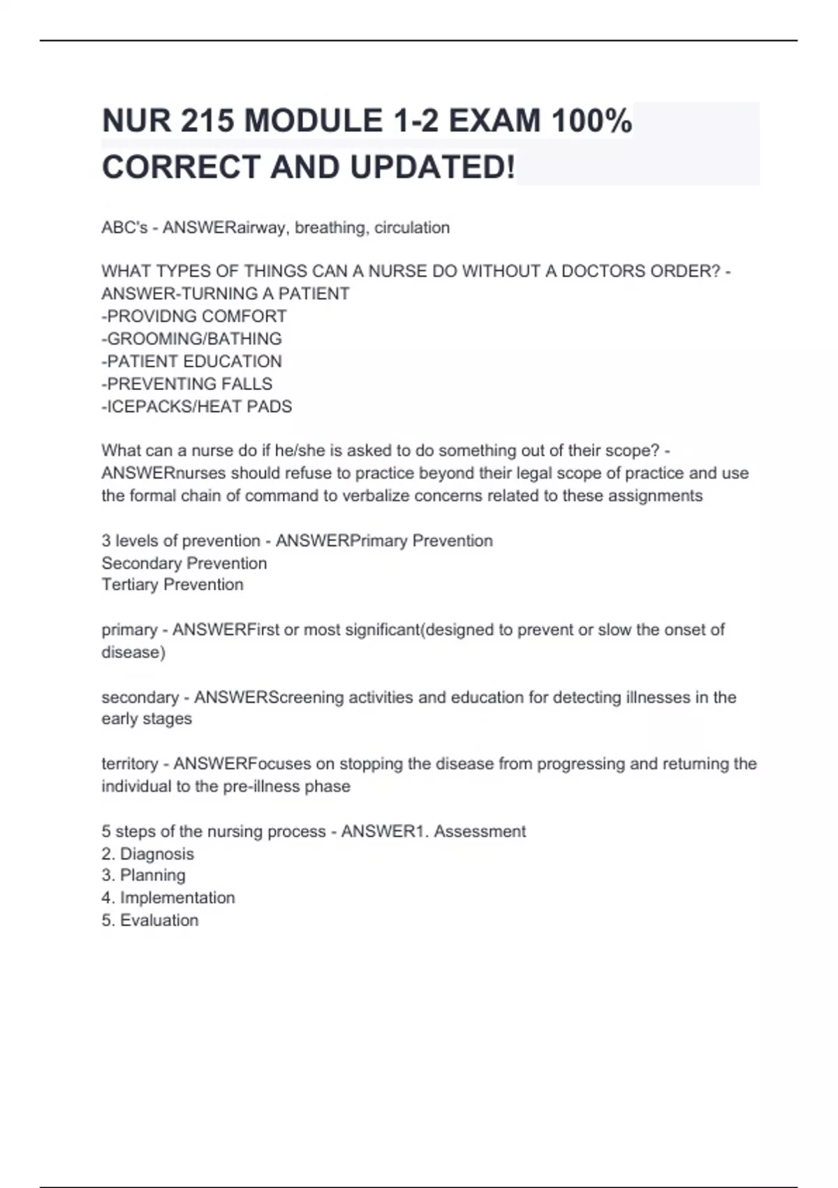 ABC's - ANSWERairway, breathing, circulation WHAT TYPES OF THINGS CAN A NURSE DO WITHOUT A DOCTORS ORDER? - ANSWER-TURNING A PATIENT -PROVIDNG COMFORT -GROOMING/BATHING -PATIENT EDUCATION -PREVENTING FALLS -ICEPACKS/HEAT PADS What can a nurse do if he/she is asked to do something out of their scope? - ANSWERnurses should refuse to practice beyond their legal scope of practice and use the formal chain of command to verbalize concerns related to these assignments 3 levels of prevention - ANSWERPrimary Prevention Secondary Prevention Tertiary Prevention primary - ANSWERFirst or most significant(designed to prevent or slow the onset of disease) secondary - ANSWERScreening activities and education for detecting illnesses in the early stages territory - ANSWERFocuses on stopping the disease from progressing and returning the individual to the pre-illness phase 5 steps of the nursing process - ANSWER1. Assessment 2. Diagnosis 3. Planning 4. Implementation 5
