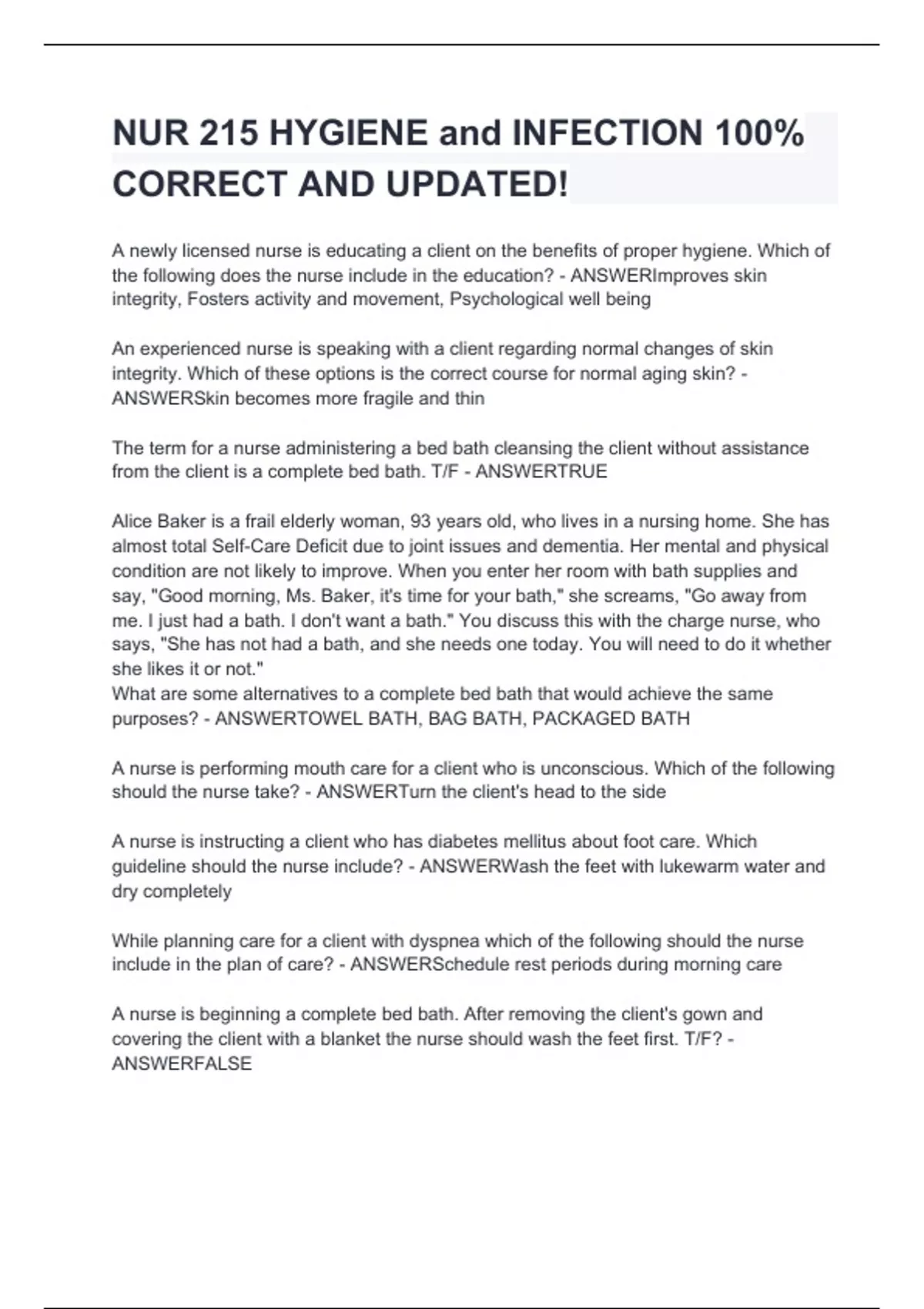A newly licensed nurse is educating a client on the benefits of proper hygiene. Which of the following does the nurse include in the education? - ANSWERImproves skin integrity, Fosters activity and movement, Psychological well being An experienced nurse is speaking with a client regarding normal changes of skin integrity. Which of these options is the correct course for normal aging skin? - ANSWERSkin becomes more fragile and thin The term for a nurse administering a bed bath cleansing the client without assistance from the client is a complete bed bath. T/F - ANSWERTRUE Alice Baker is a frail elderly woman, 93 years old, who lives in a nursing home. She has almost total Self-Care Deficit due to joint issues and dementia. Her mental and physical condition are not likely to improve. When you enter her room with bath supplies and say, "Good morning, Ms. Baker, it's time for your bath," she screams, "Go away from me. I just had a bath. I don't want a bath." You discuss this with the charge nurse, who says, "She has not had a bath, and she needs one today. You will need to do it whether she likes it or not." What are some alternatives to a complete bed bath that would achieve the same purposes? - ANSWERTOWEL BATH, BAG BATH, PACKAGED BATH A nurse is performing m
