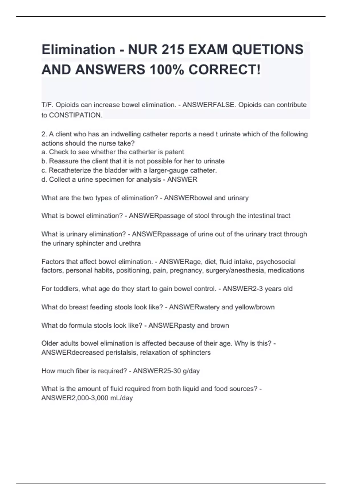 Elimination - NUR 215 EXAM QUETIONS AND ANSWERS 100% CORRECT!