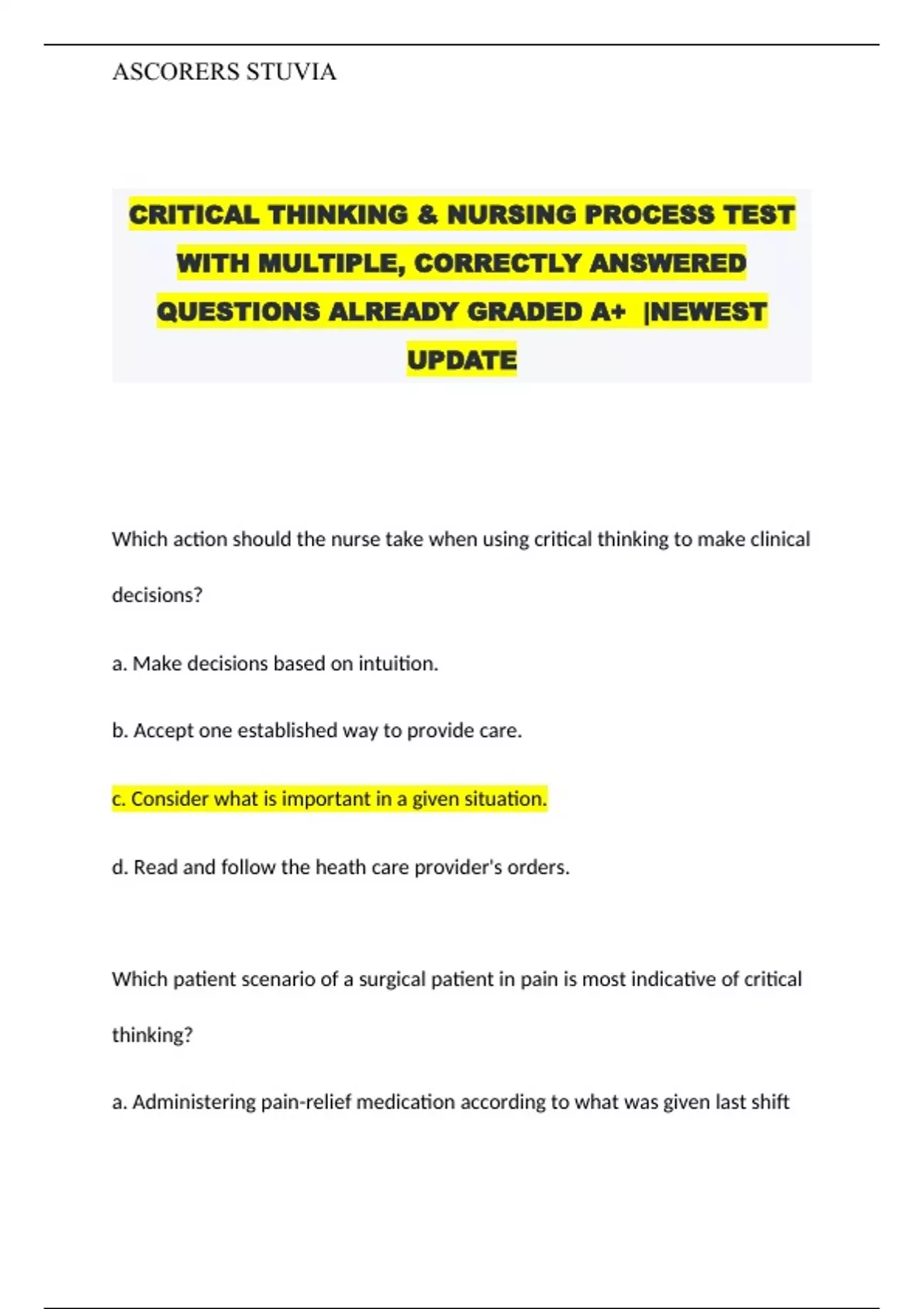 CRITICAL THINKING & NURSING PROCESS TEST WITH MULTIPLE, CORRECTLY ANSWERED QUESTIONS ALREADY GRADED A+ |NEWEST UPDATE
