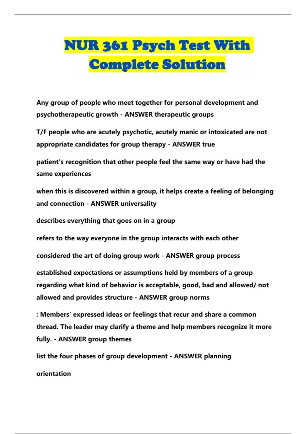 NUR 361 Psych Test With Complete Solution