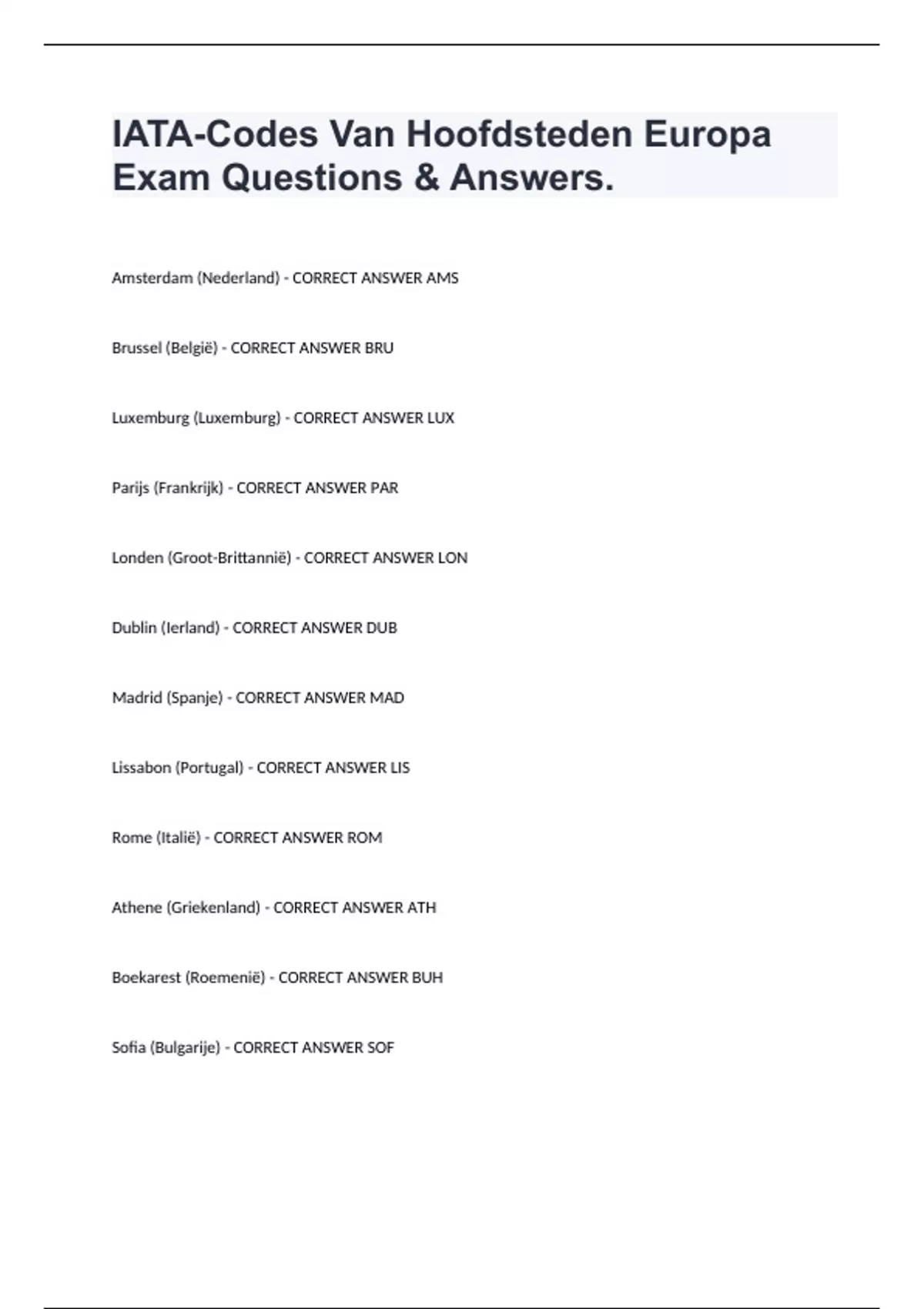 IATA-Codes Van Hoofdsteden Europa Exam Questions & Answers. Amsterdam (Nederland) - CORRECT ANSWER AMS Brussel (België) - CORRECT ANSWER BRU Luxemburg (Luxemburg) - CORRECT ANSWER LUX Parijs (Frankrijk) - CORRECT ANSWER PAR Londen (Groot-Brittannië) - CORRECT ANSWER LON Dublin (Ierland) - CORRECT ANSWER DUB Madrid (Spanje) - CORRECT ANSWER MAD Lissabon (Portugal) - CORRECT ANSWER LIS Rome (Italië) - CORRECT ANSWER ROM Athene (Griekenland) - CORRECT ANSWER ATH Boekarest (Roemenië) - CORRECT ANSWER BUH Sofia (Bulgarije) - CORRECT ANSWER SOF